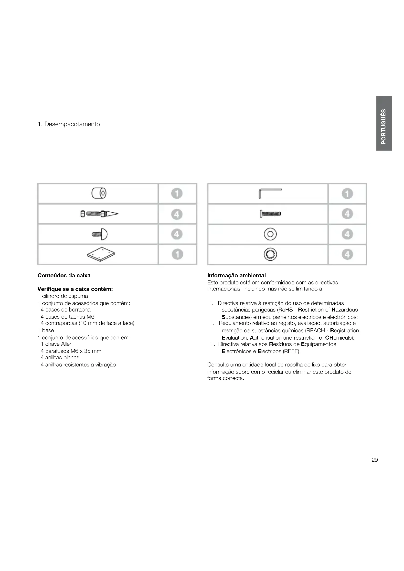 Conteúdos da caixa Verique se a caixa contém: 1 cilindro de espuma 1 conjunto de acessórios que contém: 4 bases de borracha 4 bases de tachas M6 4 contraporcas (10 mm de face a face) 1 base 1 conjunto de acessórios que contém: 1 chave Allen 4 parafusos M6 x 35 mm 4 anilhas planas 4 anilhas resistentes à vibração Informação ambiental Este produto está em conformidade com as directivas internacionais, incluindo mas não se limitando a: