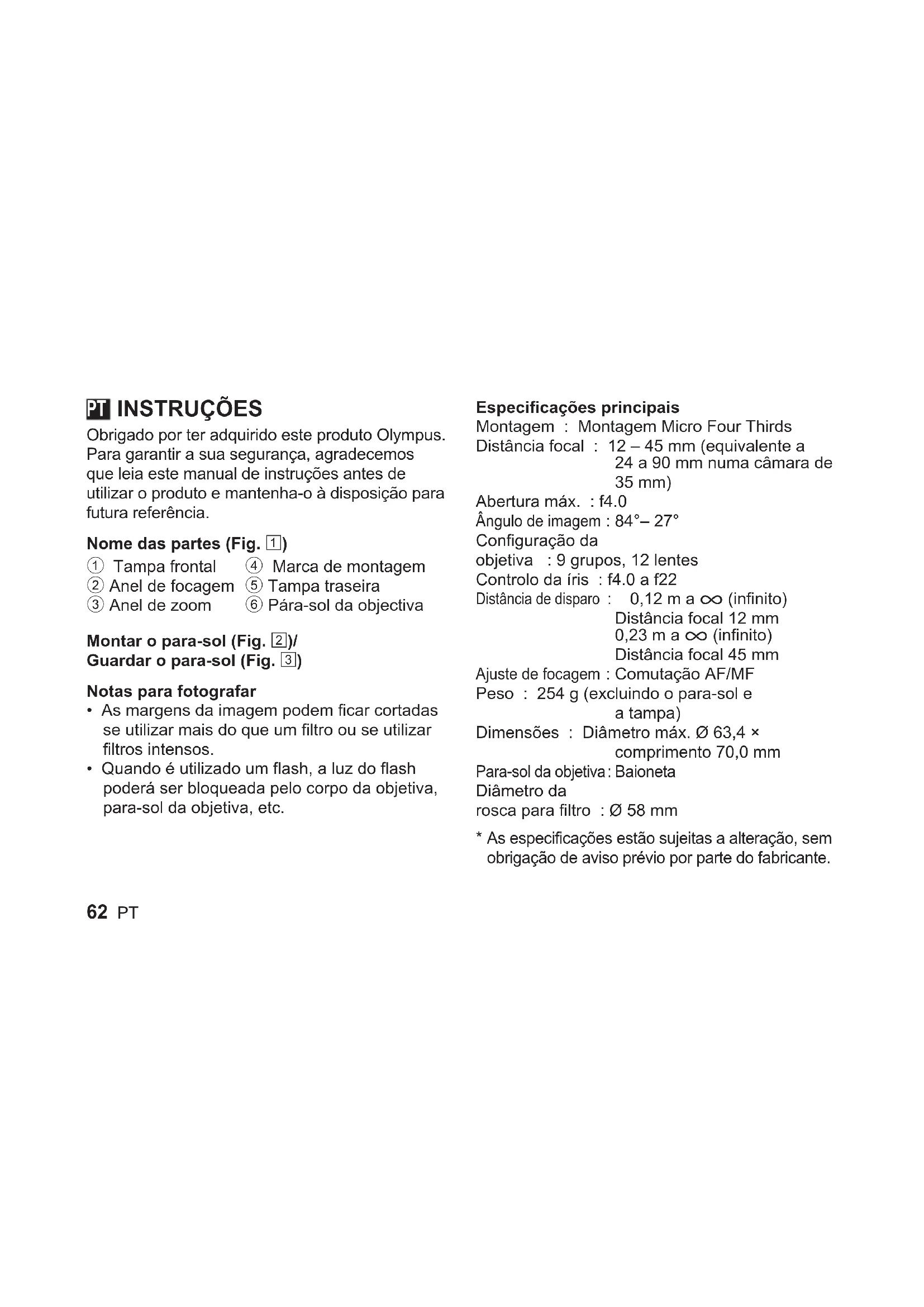 - Quando é utilizado um flash, a luz do flash poderá ser bloqueada pelo corpo da objetiva, para-sol da objetiva, etc. Especificações principais Montagem : Montagem Micro Four Thirds Distância focal : 12 – 45 mm (equivalente a 24 a 90 mm numa câmara de 35 mm) Abertura máx. : f4.0 Ângulo de imagem : 84°– 27° Configuração da objetiva : 9 grupos, 12 lentes Controlo da íris : f4.0 a f22 Distância de disparo : 0,12 m a ) (infinito) Distância focal 12 mm 0,23 m a ) (infinito) Distância focal 45 mm Ajuste de focagem : Comutação AF/MF Peso : 254 g (excluindo o para-sol e a tampa) Dimensões : Diâmetro máx. Ø 63,4 × comprimento 70,0 mm Para-sol da objetiva