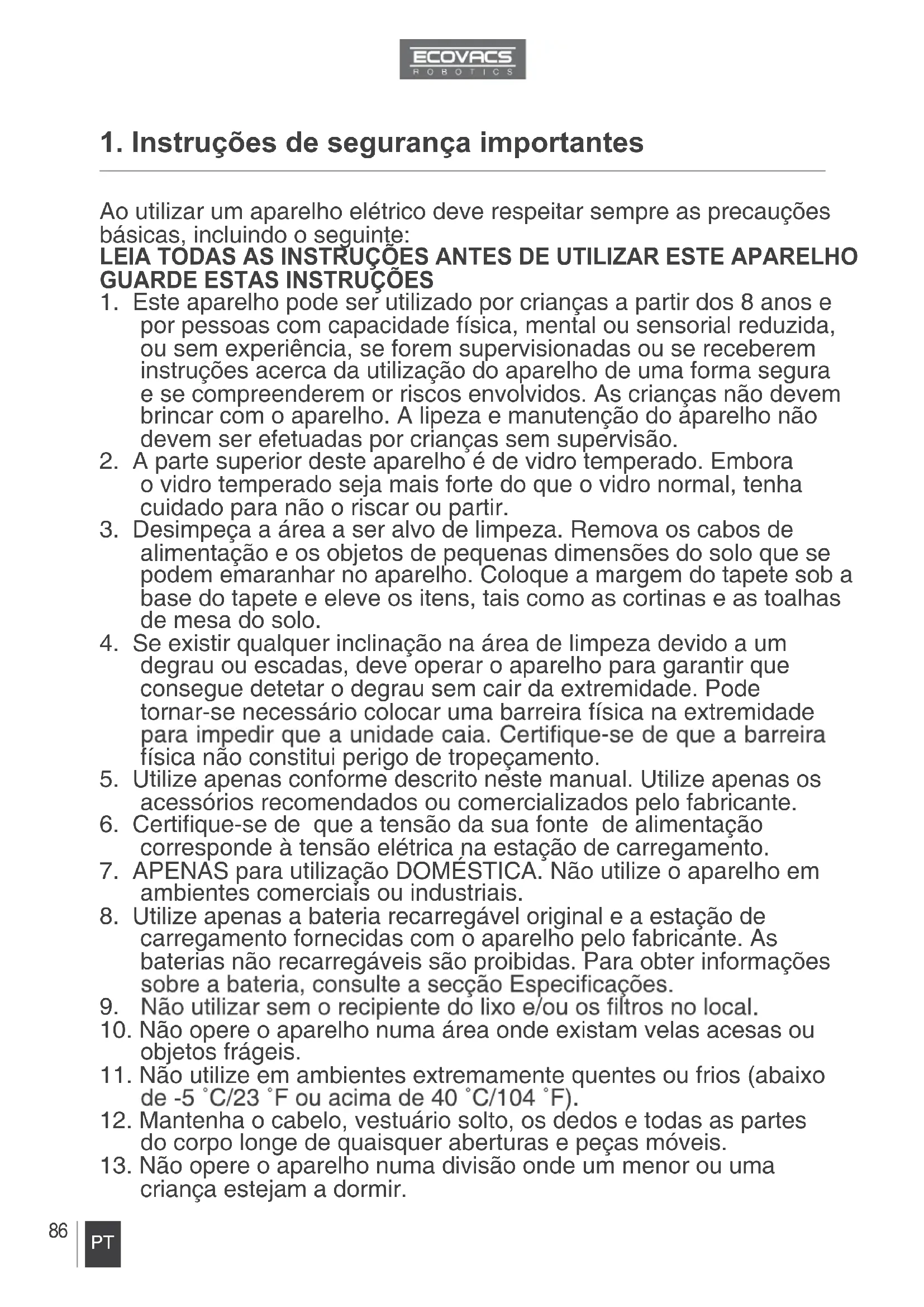 manual de instruções. A ECOVACS ROBOTICS não pode ser responsável por quaisquer danos ou ferimentos provocados pela utilização inadequada.