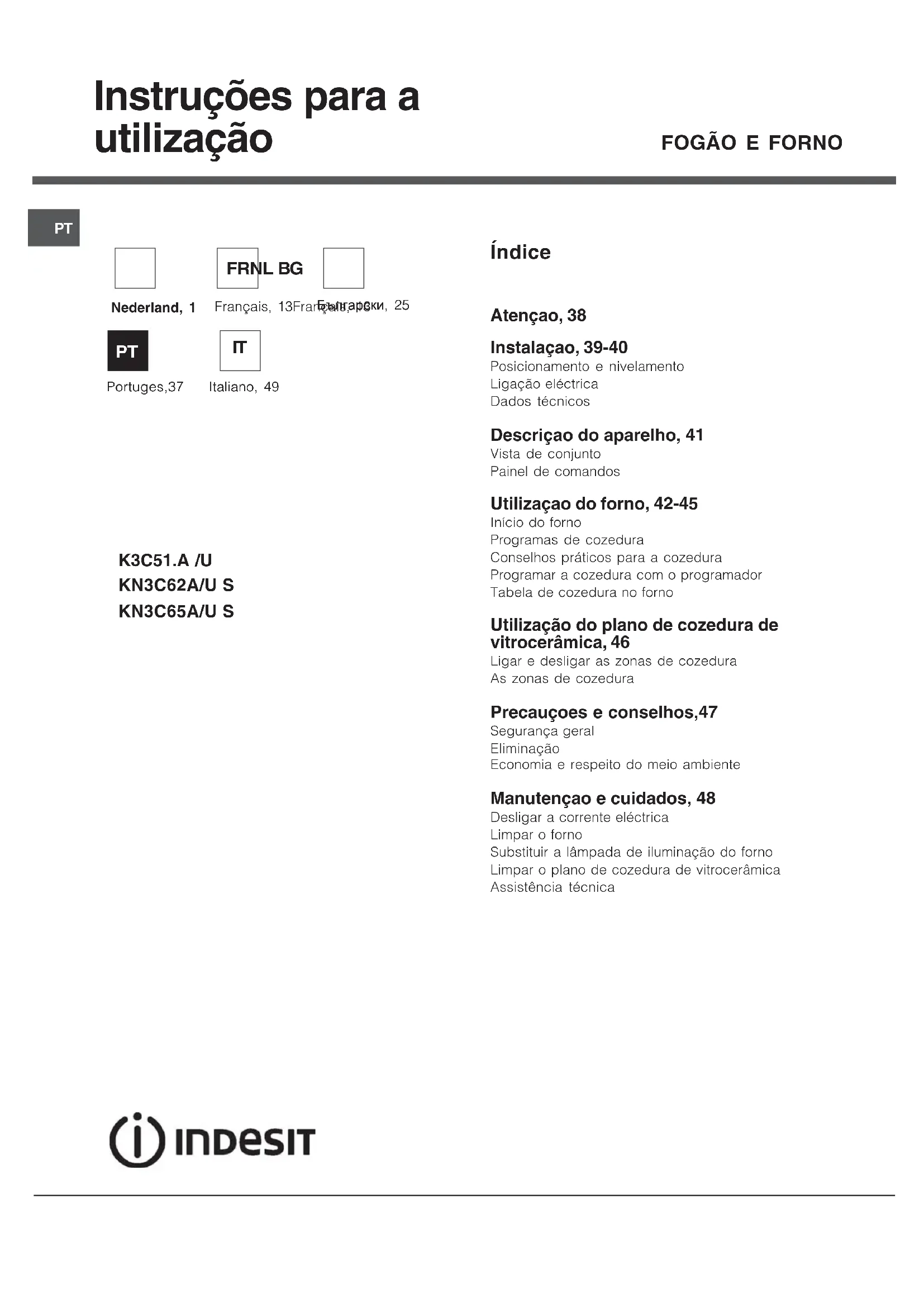 36Índice Instalaçao, 39-40 Posicionamento e nivelamento Ligação eléctrica Dados técnicos Descriçao do aparelho, 41 Vista de conjunto Painel de comandos Utilizaçao do forno, 42-45 Início do forno Programas de cozedura Conselhos práticos para a cozedura Programar a cozedura com o programador Tabela de cozedura no forno Utilização do plano de cozedura de vitrocerâmica, 46 Ligar e desligar as zonas de cozedura As zonas de cozedura Precauçoes e conselhos,47 Segurança geral Eliminação Economia e respeito do meio ambiente Manutençao e cuidados, 48 Desligar a corrente eléctrica Limpar o forno Substituir a lâmpada de iluminação do forno Limpar o plano de cozedura de vitrocerâmica Assistência técnica Instruções para a utilização