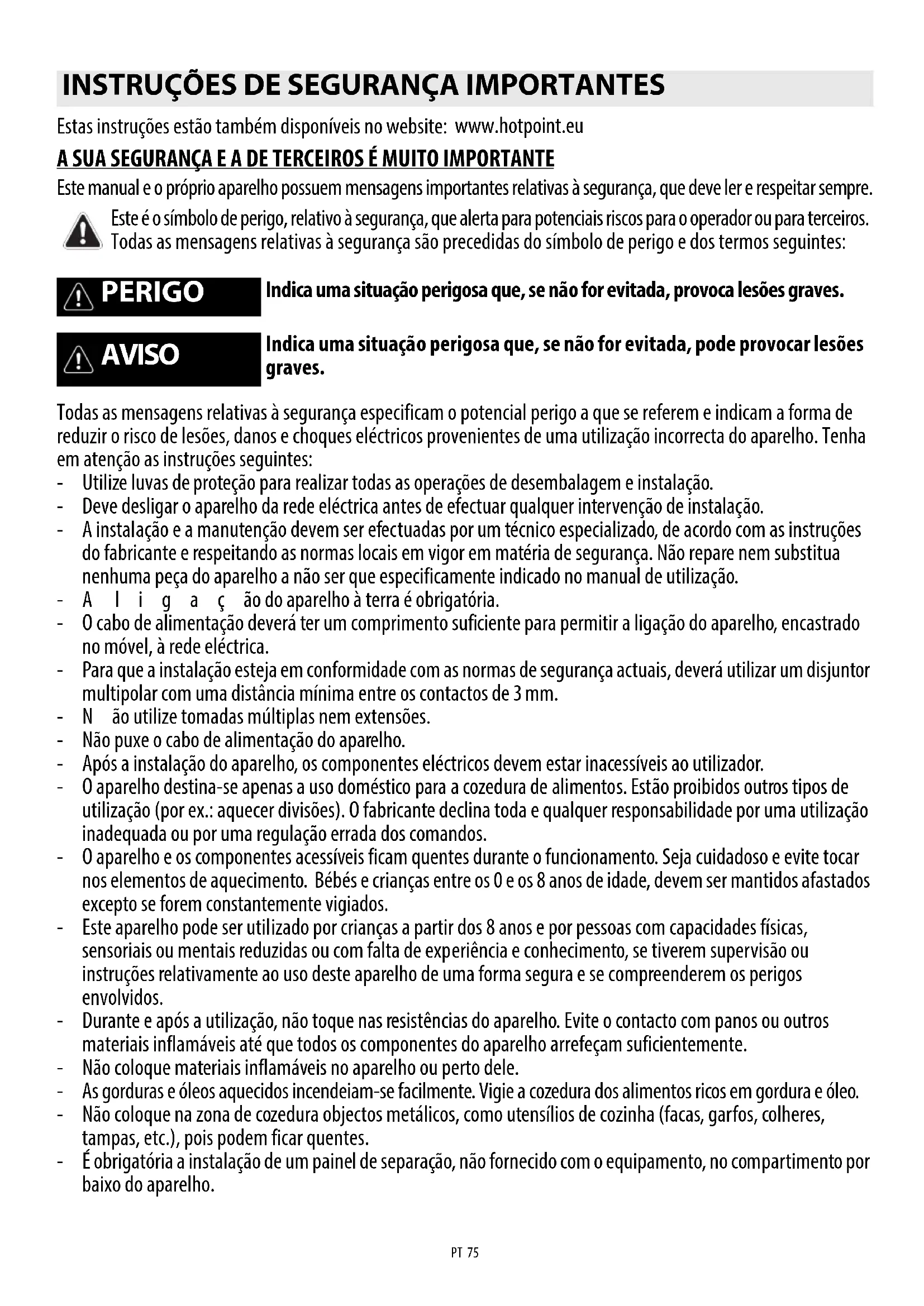 Estas instruções estão também disponíveis no website: A SUA SEGURANÇA E A DE TERCEIROS É MUITO IMPORTANTE Este manual e o próprio aparelho possuem mensagens importantes relativas à segurança, que deve ler e respeitar sempre. Todas as mensagens relativas à segurança especificam o potencial perigo a que se referem e indicam a forma de reduzir o risco de lesões, danos e choques eléctricos provenientes de uma utilização incorrecta do aparelho. Tenha em atenção as instruções seguintes: - Utilize luvas de proteção para realizar todas as operações de desembalagem e instalação. - Deve desligar o aparelho da rede eléctrica antes de efectuar qualquer intervenção de instalação. - A instalação e a manutenção devem ser efectuadas por um técnico especializado, de acordo com as instruções do fabricante e respeitando as normas locais em vigor em matéria de segurança. Não repare nem substitua nenhuma peça do aparelho a não ser que especificamente indicado no manual de utilização. -A ligação do aparelho à terra é obrigatória. - O cabo de alimentação deverá ter um comprimento suficiente para permitir a ligação do aparelho, encastrado no móvel, à rede eléctrica. - Para que a instalação esteja em conformidade com as normas de segurança actuais, deverá utilizar um disjuntor multipolar com uma distância mínima entre os contactos de 3 mm. -Não utilize tomadas múltiplas nem extensões. -Não puxe o cabo de alimentação do aparelho. - Após a instalação do aparelho, os componentes eléctricos devem estar inacessíveis ao utilizador. - O aparelho destina-se apenas a uso doméstico para a cozedura de alimentos. Estão proibidos outros tipos de utilização (por ex.: aquecer divisões). O fabricante declina toda e qualquer responsabilidade por uma utilização inadequada ou por uma regulação errada dos comandos. - O aparelho e os componentes acessíveis ficam quentes durante o funcionamento. Seja cuidadoso e evite tocar nos elementos de aquecimento. Bébés e crianças entre os 0 e os 8 anos de idade, devem ser mantidos afastados excepto se forem constantemente vigiados. - Este aparelho pode ser utilizado por crianças a partir dos 8 anos e por pessoas com capacidades físicas, sensoriais ou mentais reduzidas ou com falta de experiência e conhecimento, se tiverem supervisão ou instruções relativamente ao uso deste aparelho de uma forma segura e se compreenderem os perigos envolvidos. - Durante e após a utilização, não toque nas resistências do aparelho. Evite o contacto com panos ou outros materiais inflamáveis até que todos os componentes do aparelho arrefeçam suficientemente. -Não coloque materiais inflamáveis no aparelho ou perto dele. - As gorduras e óleos aquecidos incendeiam-se facilmente. Vigie a cozedura dos alimentos ricos em gordura e óleo. -Não coloque na zona de cozedura objectos metálicos, como utensílios de cozinha (facas, garfos, colheres, tampas, etc.), pois podem ficar quentes. - É obrigatória a instalação de um painel de separação, não fornecido com o equipamento, no compartimento por baixo do aparelho.