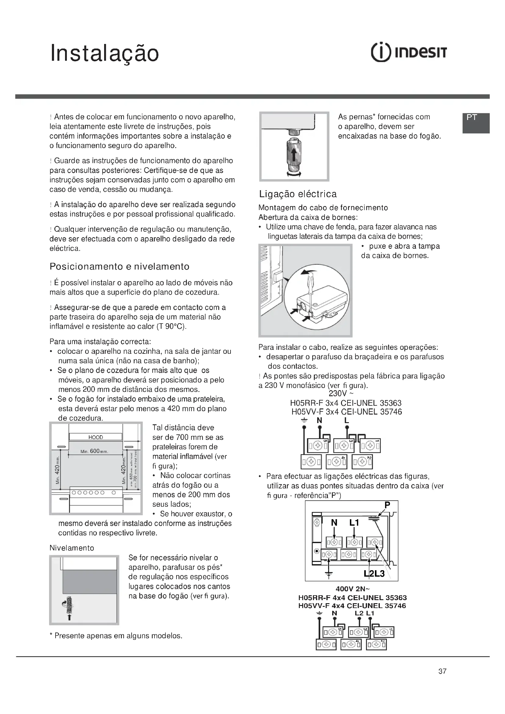 ! Antes de colocar em funcionamento o novo aparelho, leia atentamente este livrete de instruções, pois contém informações importantes sobre a instalação e o funcionamento seguro do aparelho.! Guarde as instruções de funcionamento do aparelho para consultas posteriores: Certifique-se de que as instruções sejam conservadas junto com o aparelho em caso de venda, cessão ou mudança. ! A instalação do aparelho deve ser realizada segundo estas instruções e por pessoal profissional qualificado. ! Qualquer intervenção de regulação ou manutenção, deve ser efectuada com o aparelho desligado da rede eléctrica. Posicionamento e nivelamento ! É possível instalar o aparelho ao lado de móveis não mais altos que a superfície do plano de cozedura. ! Assegurar-se de que a parede em contacto com a parte traseira do aparelho seja de um material não inflamável e resistente ao calor (T 90°C). Para uma instalação correcta: • colocar o aparelho na cozinha, na sala de jantar ou numa sala única (não na casa de banho);• Se o plano de cozedura for mais alto que os móveis, o aparelho deverá ser posicionado a pelo menos 200 mm de distância dos mesmos.• Se o fogão for instalado embaixo de uma prateleira, esta deverá estar pelo menos a 420 mm do plano de cozedura. Tal distância deve ser de 700 mm se as prateleiras forem de material inflamável (ver gura);• Não colocar cortinas atrás do fogão ou a menos de 200 mm dos seus lados;• Se houver exaustor, o mesmo deverá ser instalado conforme as instruções contidas no respectivo livrete. NivelamentoSe for necessário nivelar o aparelho, parafusar os pés* de regulação nos específicos lugares colocados nos cantos na base do fogão (ver gura).As pernas* fornecidas com o aparelho, devem ser encaixadas na base do fogão. Ligação eléctrica Montagem do cabo de fornecimentoAbertura da caixa de bornes:• Utilize uma chave de fenda, para fazer alavanca nas linguetas laterais da tampa da caixa de bornes;• puxe e abra a tampa da caixa de bornes.Para instalar o cabo, realize as seguintes operações:• desapertar o parafuso da braçadeira e os parafusos dos contactos.! As pontes são predispostas pela fábrica para ligação a 230 V monofásico (ver gura).