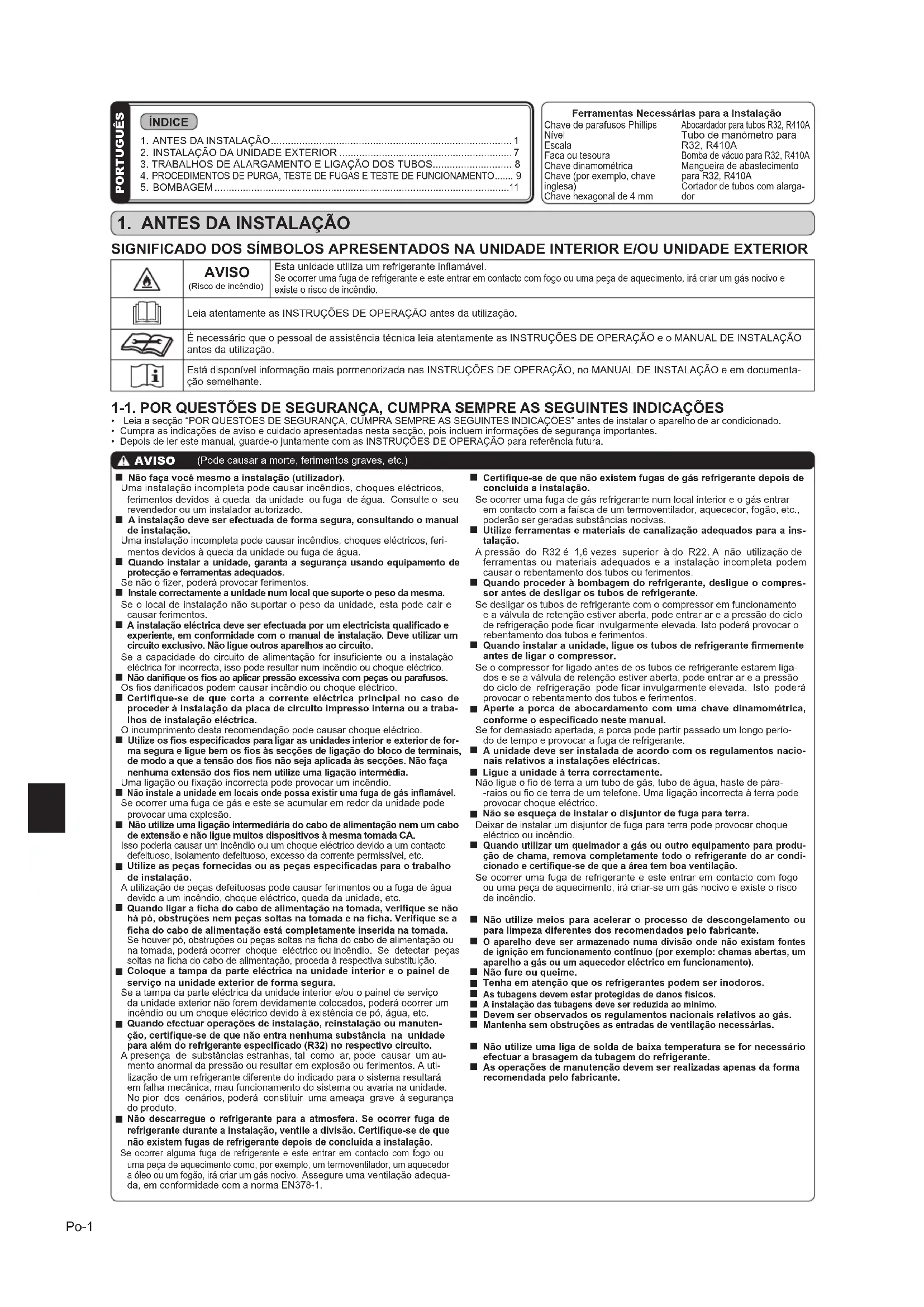 Não descarregue o refrigerante para a atmosfera. Se ocorrer fuga de refrigerante durante a instalação, ventile a divisão. Certique-se de que não existem fugas de refrigerante depois de concluída a instalação. Se ocorrer alguma fuga de refrigerante e este entrar em contacto com fogo ou uma peça de aquecimento como, por exemplo, um termoventilador, um aquecedor a óleo ou um fogão, irá criar um gás nocivo. Assegure uma ventilação adequa-da, em conformidade com a norma EN378-1. Certique-se de que não existem fugas de gás refrigerante depois de concluída a instalação. Se ocorrer uma fuga de gás refrigerante num local interior e o gás entrar em contacto com a faísca de um termoventilador, aquecedor, fogão, etc., poderão ser geradas substâncias nocivas. Utilize ferramentas e materiais de canalização adequados para a ins-talação. A pressão do R32 é 1,6 vezes superior à do R22. A não utilização de ferramentas ou materiais adequados e a instalação incompleta podem causar o rebentamento dos tubos ou ferimentos. Quando proceder à bombagem do refrigerante, desligue o compres-sor antes de desligar os tubos de refrigerante. Se desligar os tubos de refrigerante com o compressor em funcionamento e a válvula de retenção estiver aberta, pode entrar ar e a pressão do ciclo de refrigeração pode car invulgarmente elevada. Isto poderá provocar o rebentamento dos tubos e ferimentos. Quando instalar a unidade, ligue os tubos de refrigerante rmemente antes de ligar o compressor. Se o compressor for ligado antes de os tubos de refrigerante estarem liga-dos e se a válvula de retenção estiver aberta, pode entrar ar e a pressão do ciclo de refrigeração pode ficar invulgarmente elevada. Isto poderá provocar o rebentamento dos tubos e ferimentos. Aperte a porca de abocardamento com uma chave dinamométrica, conforme o especicado neste manual. Se for demasiado apertada, a porca pode partir passado um longo perío-do de tempo e provocar a fuga de refrigerante. A unidade deve ser instalada de acordo com os regulamentos nacio-nais relativos a instalações eléctricas. Ligue a unidade à terra correctamente. Não ligue o o de terra a um tubo de gás, tubo de água, haste de pára--raios ou o de terra de um telefone. Uma ligação incorrecta à terra pode provocar choque eléctrico. Não se esqueça de instalar o disjuntor de fuga para terra. Deixar de instalar um disjuntor de fuga para terra pode provocar choque eléctrico ou incêndio. Quando utilizar um queimador a gás ou outro equipamento para produ-ção de chama, remova completamente todo o refrigerante do ar condi-cionado e certique-se de que a área tem boa ventilação. Se ocorrer uma fuga de refrigerante e este entrar em contacto com fogo ou uma peça de aquecimento, irá criar-se um gás nocivo e existe o risco de incêndio. Não utilize meios para acelerar o processo de descongelamento ou para limpeza diferentes dos recomendados pelo fabricante. O aparelho deve ser armazenado numa divisão onde não existam fontes de ignição em funcionamento contínuo (por exemplo: chamas abertas, um aparelho a gás ou um aquecedor eléctrico em funcionamento). Não fure ou queime. Tenha em atenção que os refrigerantes podem ser inodoros. As tubagens devem estar protegidas de danos físicos. A instalação das tubagens deve ser reduzida ao mínimo. Devem ser observados os regulamentos nacionais relativos ao gás. Mantenha sem obstruções as entradas de ventilação necessárias. Não utilize uma liga de solda de baixa temperatura se for necessário efectuar a brasagem da tubagem do refrigerante. As operações de manutenção devem ser realizadas apenas da forma recomendada pelo fabricante. AVISO (Pode causar a morte, ferimentos graves, etc.) Ferramentas Necessárias para a Instalação Chave de parafusos Phillips Nível Escala Faca ou tesoura Chave dinamométrica Chave (por exemplo, chave inglesa) Chave hexagonal de 4 mm Abocardador para tubos R32, R410A Tubo de manómetro para R32, R410A Bomba de vácuo para R32, R410A Mangueira de abastecimento para R32, R410A Cortador de tubos com alarga- dor PORTUGUÊS ÍNDICE
