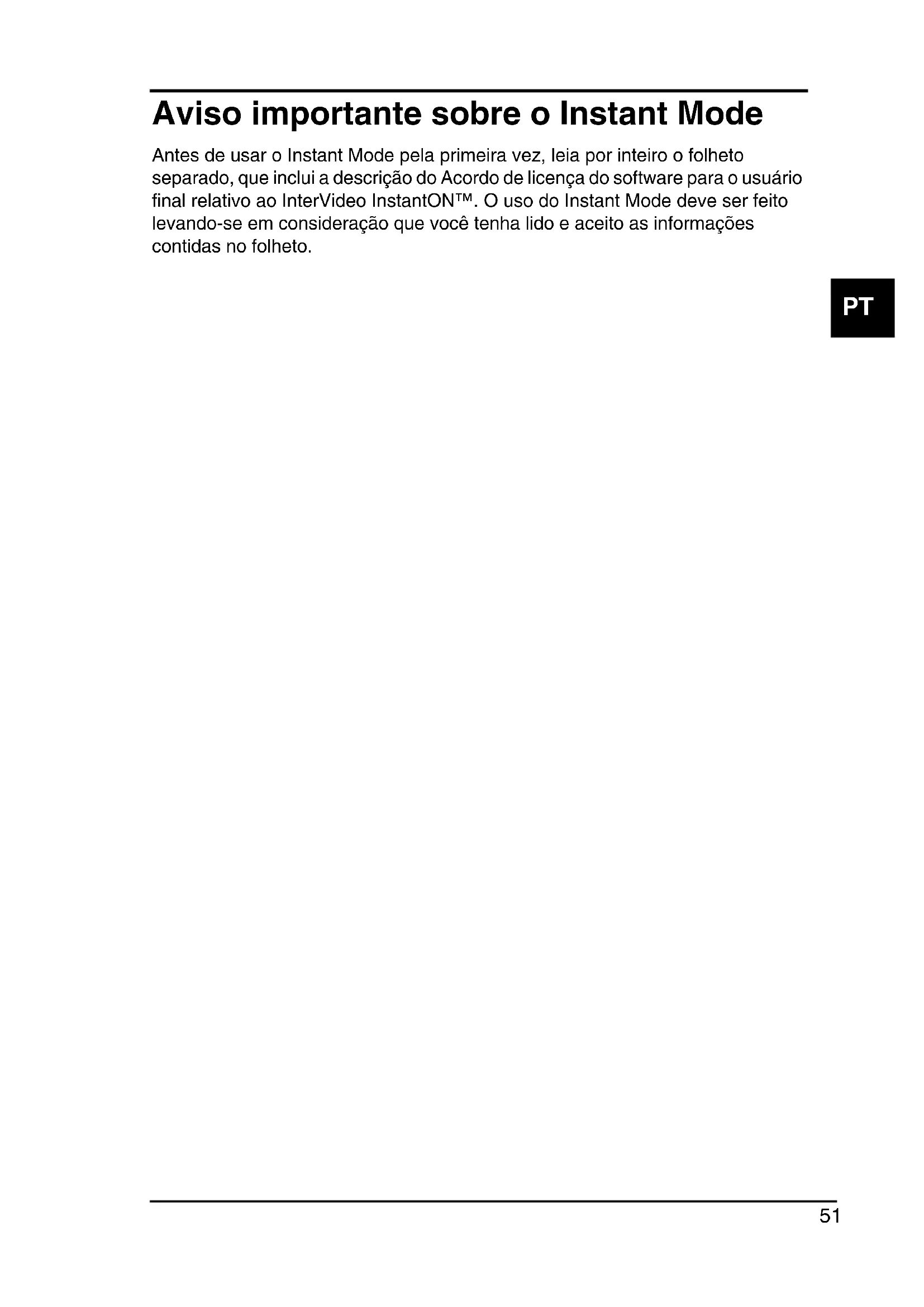 Antes de usar o Instant Mode pela primarya vez, leia por inteiro o folheto分开, que inclui a descrição do Acordo de licença do software para o uso final relativo ao InterVideo InstantON™. O uso do Instant Mode deve ser feito levando-se em consideração que você tenha lido e aceito as informações contidas no folheto.