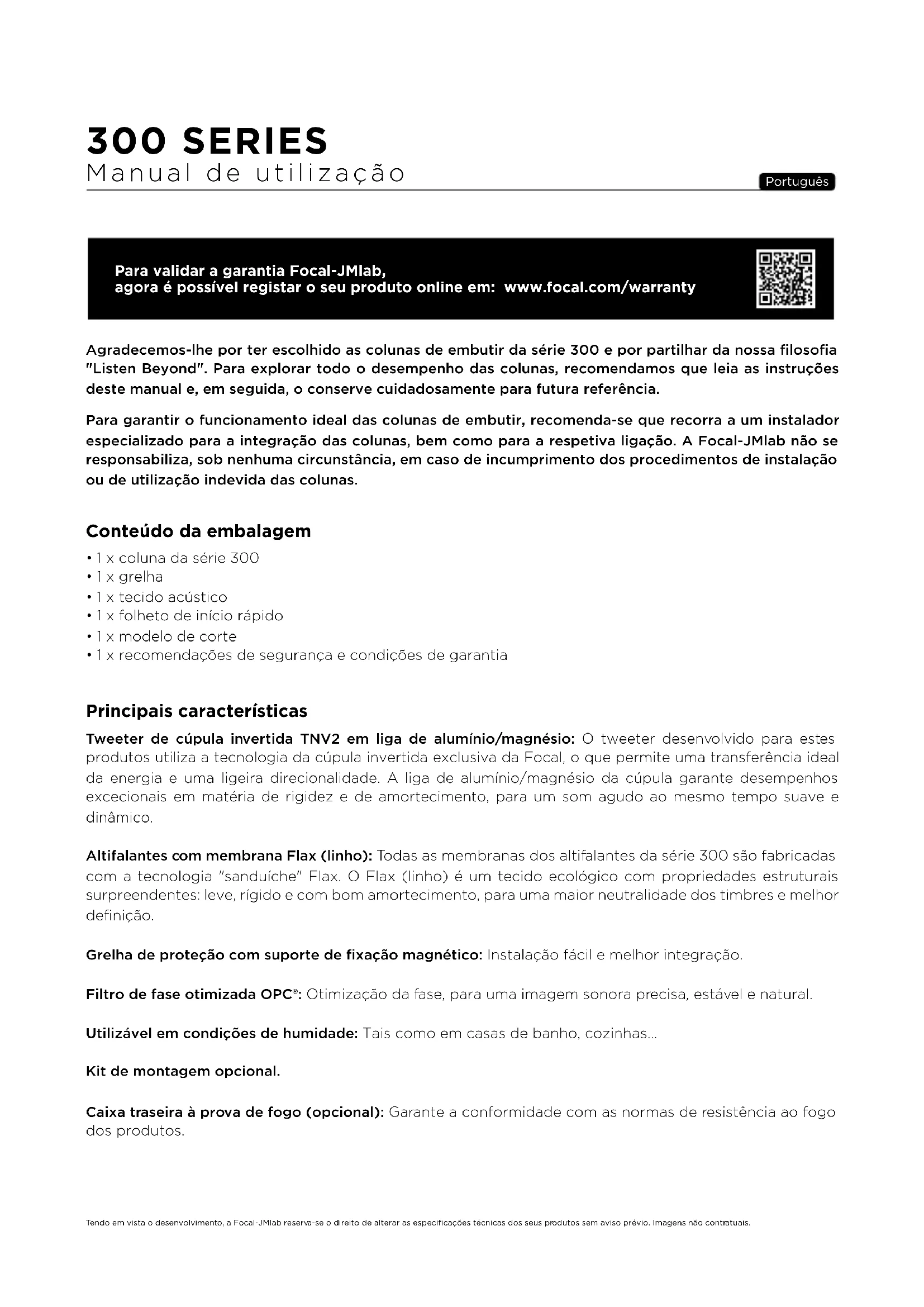 - 1 x recomendações de segurança e condições de garantia Principais características Tweeter de cúpula invertida TNV2 em liga de alumínio/magnésio: O tweeter desenvolvido para estes produtos utiliza a tecnologia da cúpula invertida exclusiva da Focal, o que permite uma transferência ideal da energia e uma ligeira direcionalidade. A liga de alumínio/magnésio da cúpula garante desempenhos excecionais em matéria de rigidez e de amortecimento, para um som agudo ao mesmo tempo suave e dinâmico. Altifalantes com membrana Flax (linho): Todas as membranas dos altifalantes da série 300 são fabricadas com a tecnologia "sanduíche" Flax. O Flax (linho) é um tecido ecológico com propriedades estruturais surpreendentes: leve, rígido e com bom amortecimento, para uma maior neutralidade dos timbres e melhor definição. Grelha de proteção com suporte de fixação magnético: Instalação fácil e melhor integração. Filtro de fase otimizada OPC®: Otimização da fase, para uma imagem sonora precisa, estável e natural. Utilizável em condições de humidade: Tais como em casas de banho, cozinhas...Kit de montagem opcional. Caixa traseira à prova de fogo (opcional): Garante a conformidade com as normas de resistência ao fogo dos produtos.43 Período de rodagem Os altifalantes utilizados nas colunas da série 300 Integration são elementos mecânicos complexos, que requerem um período de adaptação para funcionarem da melhor forma possível e se adaptarem às condições de temperatura e de humidade do seu ambiente. Este período de rodagem varia conforme as condições observadas e pode prolongar-se durante algumas semanas. Para acelerar esta operação, recomendamos que coloque as colunas em funcionamento durante cerca de vinte horas consecutivas. Logo que as características da coluna estejam totalmente estabilizadas, poderá desfrutar integralmente do desempenho das suas colunas da série 300 Integration. Cablagem antes da instalação Só poderá efetuar a montagem das colunas após a instalação dos cabos. Certifique-se de que existe um comprimento de cabo suficiente para poder ligar facilmente o produto (cerca de 50 cm). Recomendamos a utilização do cabo com uma marca de referência, de modo a respeitar a polaridade dos altifalantes (+/–). Opte por cabos de qualidade e de dimensões adequadas ao comprimento; o seu revendedor saberá aconselhá-lo. Escolha do amplificador Não é o excesso, mas antes a falta de potência de um amplificador que pode deteriorar a coluna ou os altifalantes. Com efeito, se o volume for muito elevado, o amplificador satura e produz sinais estranhos que podem destruir o tweeter. A capacidade dinâmica e a definição das colunas da série 300 Integration são suficientemente elevadas para demonstrar as qualidades e defeitos dos amplificadores que lhes estão associados. O seu revendedor saberá orientar a sua escolha em função dos seus gostos e do seu orçamento. Instalação Posicionamento das colunas As colunas da série 300 foram desenvolvidas para transmitir o mais fielmente possível todas as formas de música ou programas Home Cinema. Não obstante, convém respeitar algumas regras simples para otimizar o respetivo desempenho, garantir um bom equilíbrio tonal e uma imagem sonora realista. Utilização no modo de difusão sonora (teto) Para uma utilização como difusão sonora de fundo (cada coluna funciona de forma independente), as colunas podem ser instaladas conforme as suas necessidades e os condicionalismos arquitetónicos da divisão. Contudo, tenha o cuidado de não instalar as colunas muito perto de uma parede ou de um canto, para evitar um nível excessivo de baixas frequências. Utilização no modo de estéreo (teto ou parede) As colunas devem ser colocadas de modo simétrico em relação à área de audição, de modo a formarem idealmente um triângulo isósceles com esta. O espaço entre as duas colunas deverá ter entre 2,5 m e 4 m para uma área de audição entre 3 m e 6 m (fig. 1). Todavia, as distâncias podem variar de modo a encontrar o equilíbrio ideal em função das condições específicas de organização. As colunas deverão ser posicionadas à mesma altura e no mesmo plano horizontal (fig. 2). Em caso de utilização de colunas de teto, as colunas frontais direita e esquerda devem ser colocadas na mesma linha horizontal, afastadas entre 0,3 e 0,6 m da parede. O espaço entre as colunas direita e esquerda deve ter entre 2,5 m e 4 m (fig. 3). 300 SERIES Manual de utilização44 Utilização no modo de Home Cinema (teto ou parede)