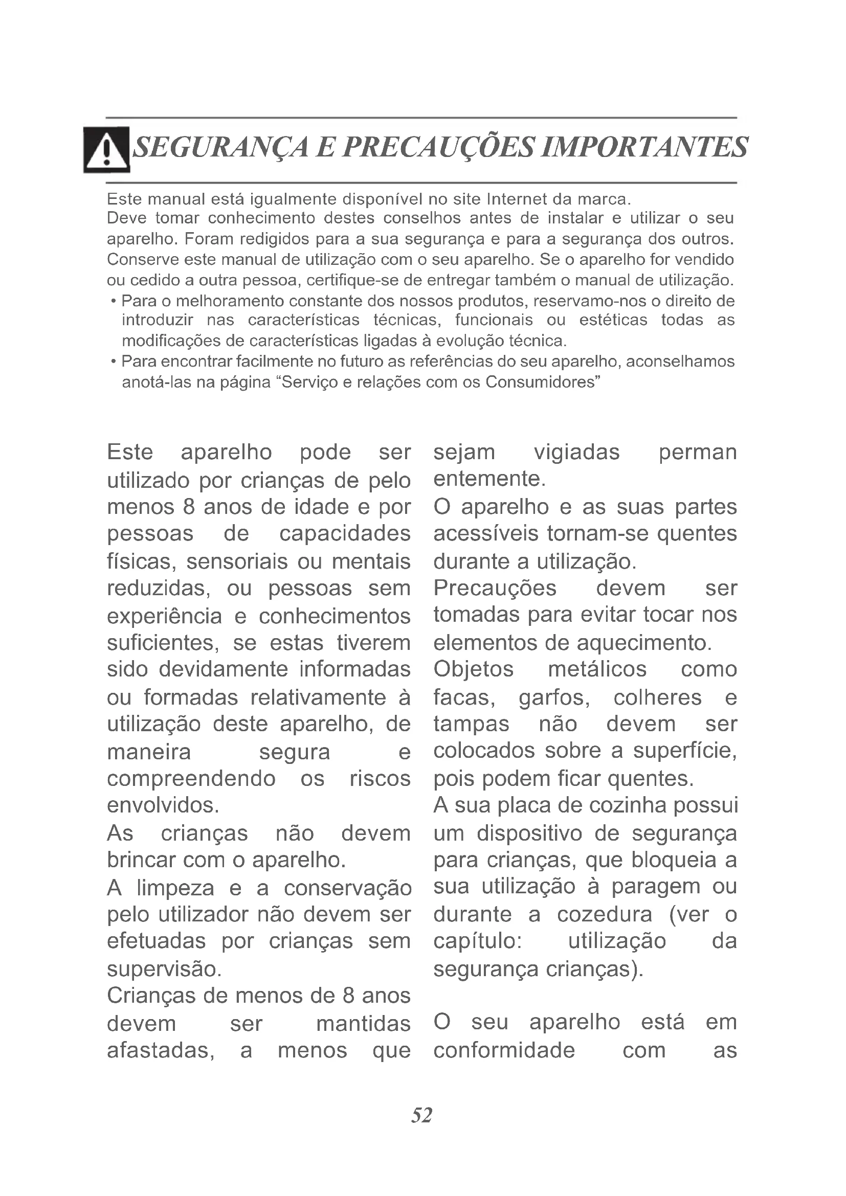 - Para encontrar facilmente no futuro as referências do seu aparelho, aconselhamos anotá-las na página “Serviço e relações com os Consumidores” Este aparelho pode ser utilizado por crianças de pelo menos 8 anos de idade e por pessoas de capacidades físicas, sensoriais ou mentais reduzidas, ou pessoas sem experiência e conhecimentos suficientes, se estas tiverem sido devidamente informadas ou formadas relativamente à utilização deste aparelho, de maneira segura e compreendendo os riscos envolvidos. As crianças não devem brincar com o aparelho. A limpeza e a conservação pelo utilizador não devem ser efetuadas por crianças sem supervisão. Crianças de menos de 8 anos devem ser mantidas afastadas, a menos que sejam vigiadas perman entemente. O aparelho e as suas partes acessíveis tornam-se quentes durante a utilização. Precauções devem ser tomadas para evitar tocar nos elementos de aquecimento. Objetos metálicos como facas, garfos, colheres e tampas não devem ser colocados sobre a superfície, pois podem ficar quentes. A sua placa de cozinha possui um dispositivo de segurança para crianças, que bloqueia a sua utilização à paragem ou durante a cozedura (ver o capítulo: utilização da segurança crianças). O seu aparelho está em conformidade com asSEGURANÇA E PRECAUÇÕES IMPORTANTES