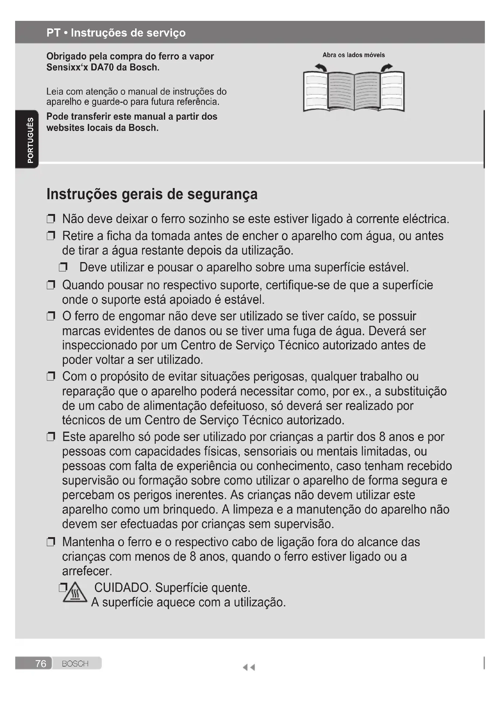 CUIDADO. Superfície quente. A superfície aquece com a utilização. Obrigado pela compra do ferro a vapor Sensixx‘x DA70 da Bosch. Leia com atenção o manual de instruções do aparelho e guarde-o para futura referência. Pode transferir este manual a partir dos websites locais da Bosch. Abra os lados móveis77 B O S C H