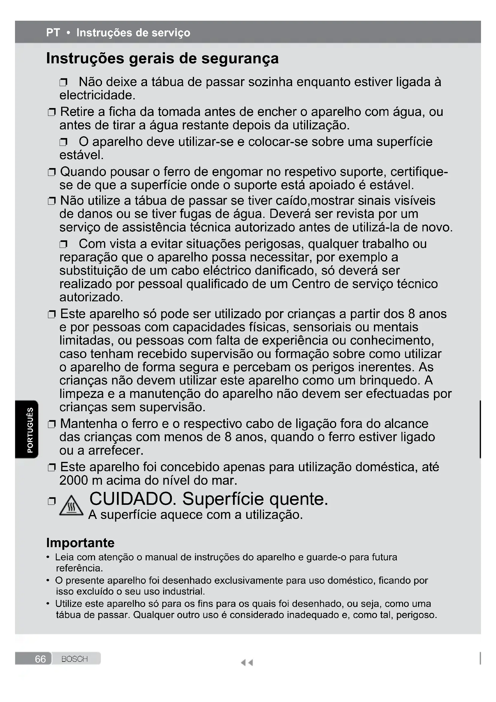- Leia com atenção o manual de instruções do aparelho e guarde-o para futura referência.• O presente aparelho foi desenhado exclusivamente para uso doméstico, ficando por isso excluído o seu uso industrial.• Utilize este aparelho só para os fins para os quais foi desenhado, ou seja, como uma tábua de passar. Qualquer outro uso é considerado inadequado e, como tal, perigoso. Instruções gerais de segurança ❐ Não deixe a tábua de passar sozinha enquanto estiver ligada à electricidade. ❐ Retire a ficha da tomada antes de encher o aparelho com água, ou antes de tirar a água restante depois da utilização. ❐ O aparelho deve utilizar-se e colocar-se sobre uma superfície estável. ❐ Quando pousar o ferro de engomar no respetivo suporte, certifique- se de que a superfície onde o suporte está apoiado é estável. ❐ Não utilize a tábua de passar se tiver caído,mostrar sinais visíveis de danos ou se tiver fugas de água. Deverá ser revista por um serviço de assistência técnica autorizado antes de utilizá-la de novo. ❐ Com vista a evitar situações perigosas, qualquer trabalho ou reparação que o aparelho possa necessitar, por exemplo a substituição de um cabo eléctrico danificado, só deverá ser realizado por pessoal qualificado de um Centro de serviço técnico autorizado. ❐ Este aparelho só pode ser utilizado por crianças a partir dos 8 anos e por pessoas com capacidades físicas, sensoriais ou mentais limitadas, ou pessoas com falta de experiência ou conhecimento, caso tenham recebido supervisão ou formação sobre como utilizar o aparelho de forma segura e percebam os perigos inerentes. As crianças não devem utilizar este aparelho como um brinquedo. A limpeza e a manutenção do aparelho não devem ser efectuadas por crianças sem supervisão. ❐ Mantenha o ferro e o respectivo cabo de ligação fora do alcance das crianças com menos de 8 anos, quando o ferro estiver ligado ou a arrefecer. ❐ Este aparelho foi concebido apenas para utilização doméstica, até 2000 m acima do nível do mar. ❐ CUIDADO. Superfície quente. A superfície aquece com a utilização.67 B O S C H PORTUGUÊS