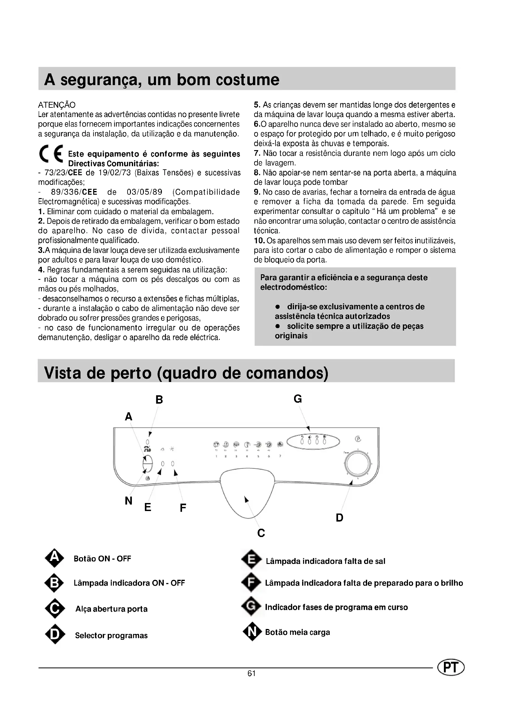 Come colocar a máquina em funcionamento Como iniciar um programa de lavagem .... Depois de ter efectuado todas as operações apresentadas nos capítulos anteriores e ter aberto inteiramente a torneira de água, carregue no botão ON-OFF "A" situado no quadro de comandos; a luz indicadora "B" acender-se-á.Nesta altu- ra a máquina estará sob tensão e será possível escolher o programa de lavagem. Início e selecção do programa. Rode na direcção horária o botão de selecção de programas "D" até a marca de referência do botão coincidir com o símbolo do ciclo que desejar programar (consulte, especialmente nos primeiro tempos, a tabela dos programas que há neste manual). Depois de alguns segundos, a luz indicadora "G" correspondente à fase de início do programa acender-se-á para indicar que o ciclo de lavagem começou e não é mais aconselhável modificá-lo. Entretanto, se for necessário, leia o parágrafo "Anulação ou modificação de um programa em curso". Luzes indicadoras do avanço do ciclo A máquina de lavar louça é dotada de 4 luzes indicadoras "G" que acendem-se em sequência quando a máquina estiver a efectuar a respectiva fase do programa . Estas fases, da esquerda para a direita, são: pré-lavagem, lavagem, enxaguada, enxugada Anulação ou modificação de um programa em curso..... Premissa: É possível anular um programa em curso somente se tiver iniciado há pouco.. Per modificar um programa em curso, rode na direcção antiorária o botão "D" até chegar à posição de RESET (restabelecimento). Depois de aproximadamente 4 segundos, apagar-se-á a luz indicadora "G" correspondente à fase que estiver a ser realizada e todas as regulações serão anuladas. Para seleccionar um novo programa, repita as instruções apresentadas no parágrafo "Início e selecção do programa" Caso se tenha esquecido de colocar um utensílio ... É possível interromper o ciclo de lavagem se premir a tecla ON-OFF, em seguida colocar a louça na máquina e ao ligá-la novamente o ciclo reiniciará do ponto em que tiver sido interrompido. No fim da lavagem.... O fim do programa é assinalado pela luz indicadora "G" correspondente à enxugada a piscar. Coloque novamente o selector na posição de RESET (Restabelecimento). Feche a torneira da água e abra a porta da máquina. Aguarde alguns minutos antes de tirar o que estiver dentro da máquina, assim evitará manusear as peças ainda quentes que poderão então enxugarem-se melhor. Botões para modificar o programa Tecla 1/2 carga Este botão (ver “vista de perto (quadro de comandos)”na letra “N”) permite lavar apenas no cesto superior, caso não haja louça suficiente para efectuar uma carga completa. Desta maneira é possível economizar água e energia eléctrica. Pode ser utilizado em todos os ciclos de lavagem presentes na tabela de programas.67