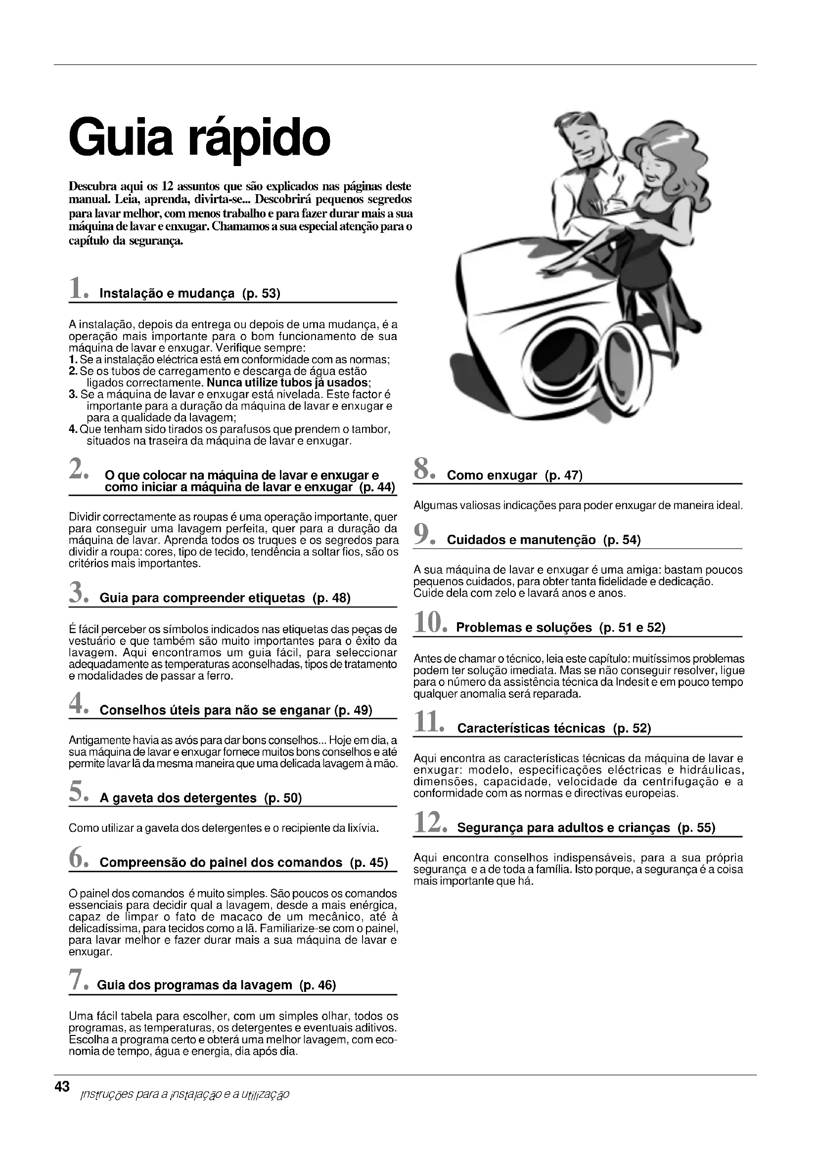 FInstrucciones para la instalación y el uso 42Instruções para a instalação e a utilização Descubra aqui os 12 assuntos que são explicados nas páginas deste manual. Leia, aprenda, divirta-se... Descobrirá pequenos segredos para lavar melhor, com menos trabalho e para fazer durar mais a sua máquina de lavar e enxugar. Chamamos a sua especial atenção para o capítulo da segurança. Guia rápido