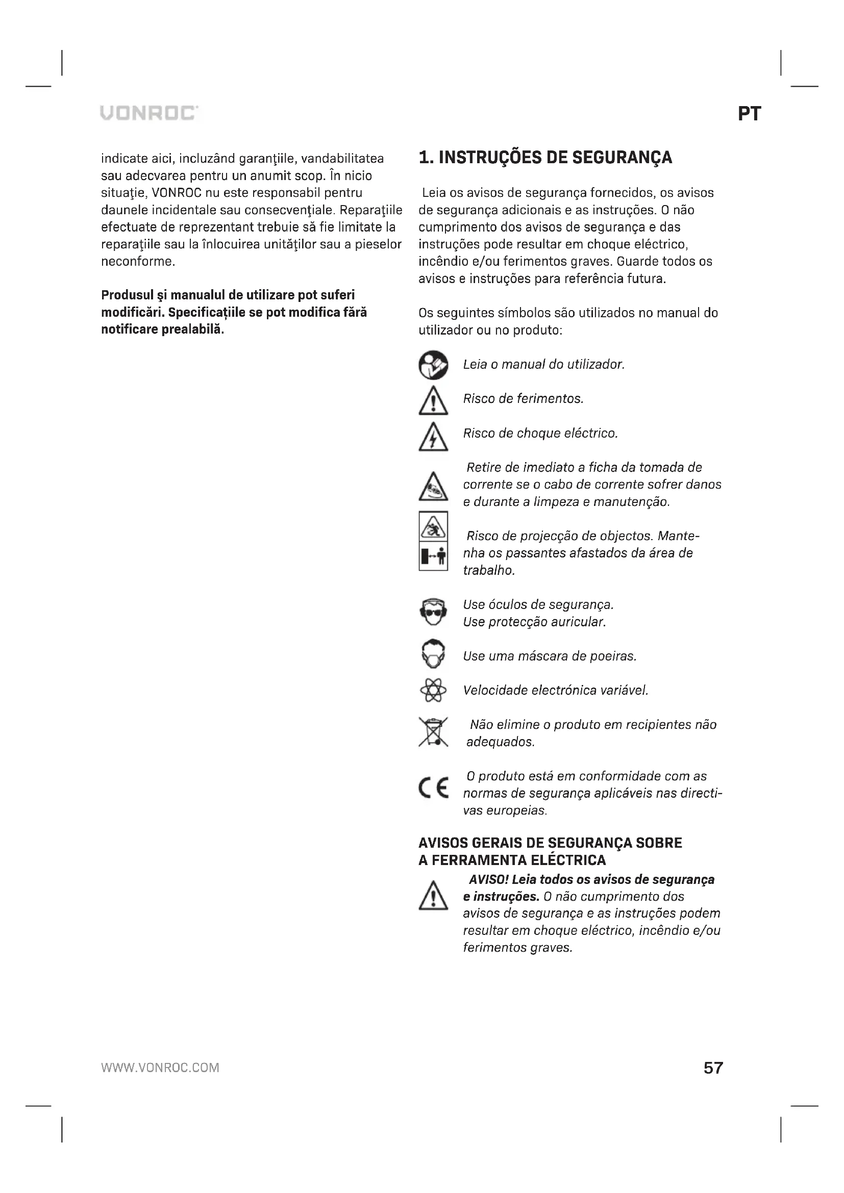 - Para montar oacessório, efectue oprocedimen- to descrito na secção correspondente. AMBIENTE Os equipamentos eléctricos ou electrónicos defeituosos e/ou eliminados devem ser recolhidos em locais de reciclagem adequados. Apenas para os países da CE Não elimine as ferramentas eléctricas em conjun- to com os resíduos domésticos. De acordo com adirectiva europeia 2012/19/CE sobre resíduos de equipamentos eléctricos eelectrónicos eares- pectiva implementação na legislação nacional, as ferramentas eléctricas que já não sejam utilizadas devem ser recolhidas em separado eeliminadas de maneira ecológica. GARANTIA Os produtos da VONROC são desenvolvidos de acordo com os padrões de qualidade mais elevados enão apresentam quaisquer defeitos em termos de materiais emão-de-obra em relação ao período estipulado por lei, cujo início é apartir da data de compra original. Se oproduto apresentar qualquer falha durante este período devido aqualquer defeito de material e/ou de mão-de- obra, contacte aVONROC directamente. As seguintes circunstâncias estão excluídas desta garantia: