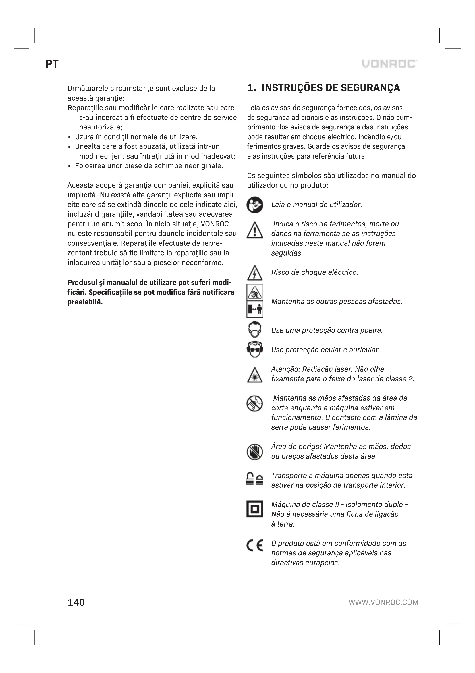 AMBIENTE Os equipamentos eléctricos ou electrónicos defeituosos e/ou eliminados devem ser recolhidos em locais de reciclagem adequa- dos. Apenas para os países da CE Não elimine as ferramentas eléctricas em conjun- to com os resíduos domésticos. De acordo com a directiva europeia 2012/19/UE sobre resíduos de equipamentos eléctricos e electrónicos e a respectiva implementação na legislação nacional, as ferramentas eléctricas que já não sejam utilizadas devem ser recolhidas em separado e eliminadas de maneira ecológica. GARANTIA Os produtos da VONROC são desenvolvidos de acordo com os padrões de qualidade mais elevados e não apresentam quaisquer defeitos em termos de materiais e mão-de-obra em relação ao período estipulado por lei, cujo início é a partir da data de compra original. Se o produto apresentar qual- quer falha durante este período devido a qualquer defeito no material e/ou de mão-de-obra, contacte a VONROC directamente. As seguintes circunstâncias estão excluídas desta garantia: