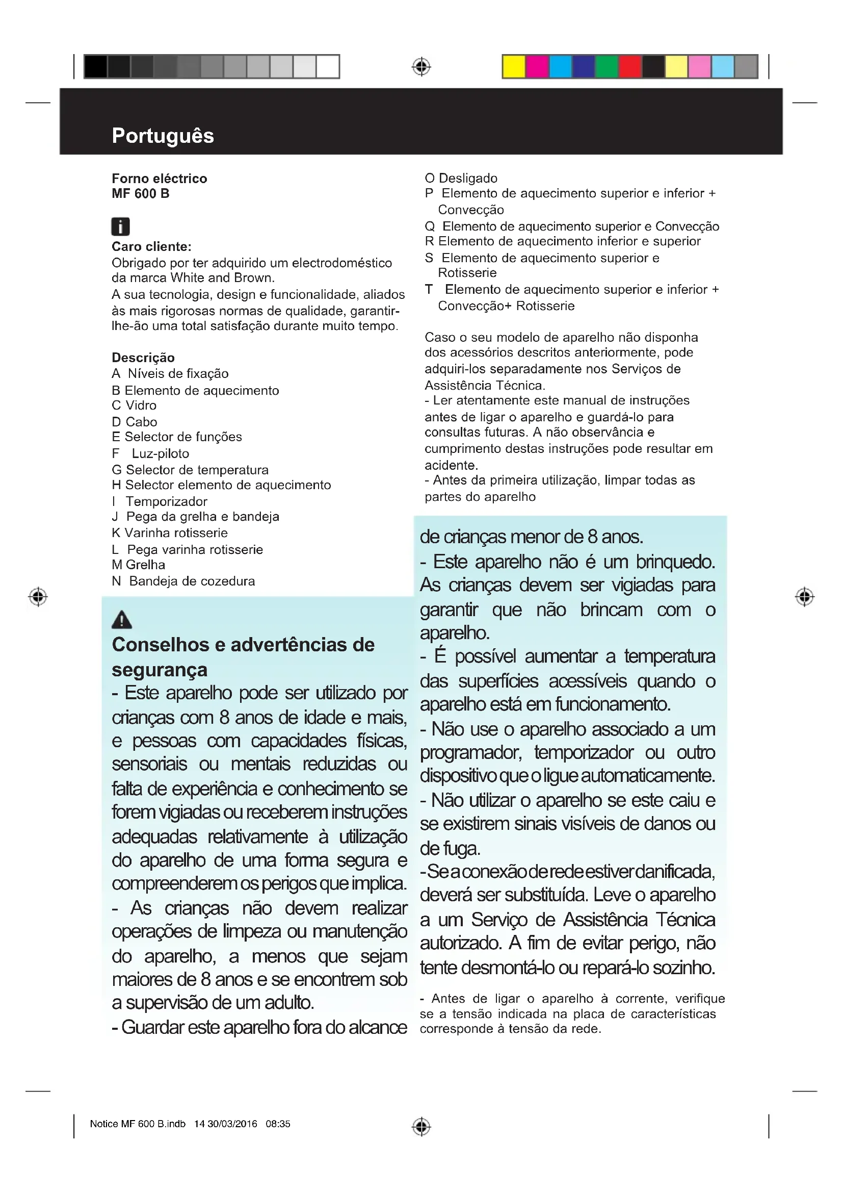 CUALQUIER OTRO LÍQUIDO. - Limpiar el aparato con un paño húmedo impregnado con unas gotas de detergente y secarlo después. - No utilizar disolventes, ni productos con un factor pH ácido o básico como la lejía, ni productos abrasivos, para la limpieza del aparato. - No deje entrar agua u otro líquido por las aberturas de ventilación para evitar daños en las partes operativas interiores del aparato. - No sumergir el aparato en agua u otro líquido, ni ponerlo bajo el grifo. - Se recomienda limpiar el aparato regularmente y retirar todos los restos de alimentos. - Si el aparato no se mantiene en buen estado de limpieza, su supercie puede degradarse y afectar de forma inexorable la duración de la vida del aparato y conducir a una situación peligrosa. - A continuación, seque todas las piezas antes de su montaje y guardado. Anomalías y reparación - En caso de avería llevar el aparato a un Servicio de Asistencia Técnica autorizado. No intente des- montarlo o repararlo ya que puede existir peligro. Para las versiones EU del producto y/o en el caso de que en su país aplique: Ecología y reciclabilidad del producto - Los materiales que constituyen el envase de este aparato, están integrados en un sistema de recogida, clasicación y reciclado de los mismos. Si desea deshacerse de ellos, puede utilizar los contenedores públicos apropiados para cada tipo de material. - El producto está exento de concentraciones de sustancias que se puedan considerar dañinas para el medio ambiente. - Este símbolo signica que si desea deshacerse del producto, una vez transcurrida la vida del mismo, debe depositarlo por los medios adecuados a manos de un gestor de residuos au- torizado para la recogida selectiva de Residuos de Aparatos Eléctricos y Electrónicos (RAEE). - Este símbolo indica que la supercie puede calentarse durante el uso. Este aparato cumple con la Directiva 2014/35/ EC de Baja Tensión, con la Directiva 2014/30/ EC de Compatibilidad Electromagnética, con la Directiva 2011/65/EU sobre restricciones a la utili- zación de determinadas sustancias peligrosas en aparatos eléctricos y electrónicos y con la Direc- tiva 2009/125/EC sobre los requisitos de diseño ecológico aplicable a los productos relacionados con la energía. Notice MF 600 B.indb 13 30/03/2016 08:35Português de crianças menor de 8 anos. - Este aparelho não é um brinquedo. As crianças devem ser vigiadas para garantir que não brincam com o aparelho. - É possível aumentar a temperatura das superfícies acessíveis quando o aparelho está em funcionamento. - Não use o aparelho associado a um programador, temporizador ou outro dispositivo que o ligue automaticamente. - Não utilizar o aparelho se este caiu e se existirem sinais visíveis de danos ou de fuga. - Se a conexão de rede estiver danificada, deverá ser substituída. Leve o aparelho a um Serviço de Assistência Técnica autorizado. A fim de evitar perigo, não tente desmontá-lo ou repará-lo sozinho. - Antes de ligar o aparelho à corrente, verique se a tensão indicada na placa de características corresponde à tensão da rede. Forno eléctrico MF 600 B Caro cliente: Obrigado por ter adquirido um electrodoméstico da marca White and Brown. A sua tecnologia, design e funcionalidade, aliados às mais rigorosas normas de qualidade, garantir- lhe-ão uma total satisfação durante muito tempo. Descrição A Níveis de xação B Elemento de aquecimento C Vidro D Cabo E Selector de funções F Luz-piloto G Selector de temperatura H Selector elemento de aquecimento I Temporizador J Pega da grelha e bandeja K Varinha rotisserie L Pega varinha rotisserie M Grelha N Bandeja de cozedura O Desligado P Elemento de aquecimento superior e inferior + Convecção Q Elemento de aquecimento superior e Convecção R Elemento de aquecimento inferior e superior S Elemento de aquecimento superior e Rotisserie T Elemento de aquecimento superior e inferior + Convecção+ Rotisserie Caso o seu modelo de aparelho não disponha dos acessórios descritos anteriormente, pode adquiri-los separadamente nos Serviços de Assistência Técnica. - Ler atentamente este manual de instruções antes de ligar o aparelho e guardá-lo para consultas futuras. A não observância e cumprimento destas instruções pode resultar em acidente. - Antes da primeira utilização, limpar todas as partes do aparelho Conselhos e advertências de segurança - Este aparelho pode ser utilizado por crianças com 8 anos de idade e mais, e pessoas com capacidades físicas, sensoriais ou mentais reduzidas ou falta de experiência e conhecimento se forem vigiadas ou receberem instruções adequadas relativamente à utilização do aparelho de uma forma segura e compreenderem os perigos que implica. - As crianças não devem realizar operações de limpeza ou manutenção do aparelho, a menos que sejam maiores de 8 anos e se encontrem sob a supervisão de um adulto. - Guardar este aparelho fora do alcance Notice MF 600 B.indb 14 30/03/2016 08:35Português - Ligar o aparelho a uma tomada com ligação à terra e com capacidade mínima de 10 amperes. A cha do aparelho deve coincidir com a tomada de corrente eléctrica. Nunca modique a cha. Não use adaptadores de cha. - Não force o cabo de alimentação. Nunca use o cabo de alimentação para levantar, transportar ou desligar o aparelho da corrente. - Não deixar que o cabo eléctrico de ligação que preso ou dobrado. - Não deixe o cabo de alimentação em contacto com as superfícies quentes do aparelho. - Verique o estado do cabo de alimentação. Os cabos danicados ou entrelaçados aumentam o risco de choque eléctrico. - Não tocar na cha de ligação com as mãos molhadas. - Não utilize o aparelho com o cabo de alimentação ou a cha danicados. - Se algum dos elementos que envolvem o aparelho se partir, desligue imediatamente o aparelho da corrente para evitar a possibilidade de sofrer um choque eléctrico. - Este aparelho não é adequado para ser 