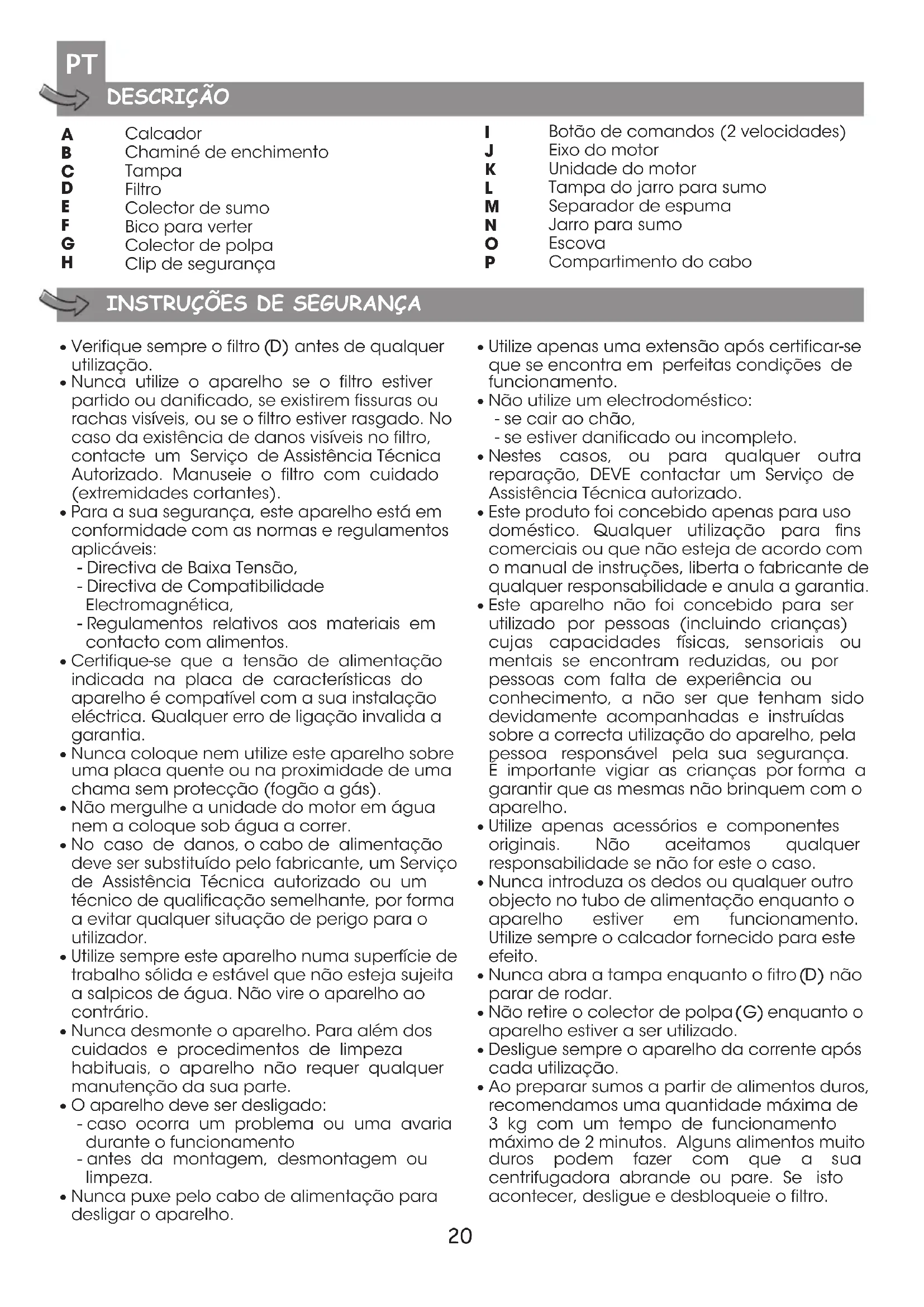 - O aparelho não deve ser utilizado para cana- de-açúcar e fruta excessivamente rija ou fibrosa.