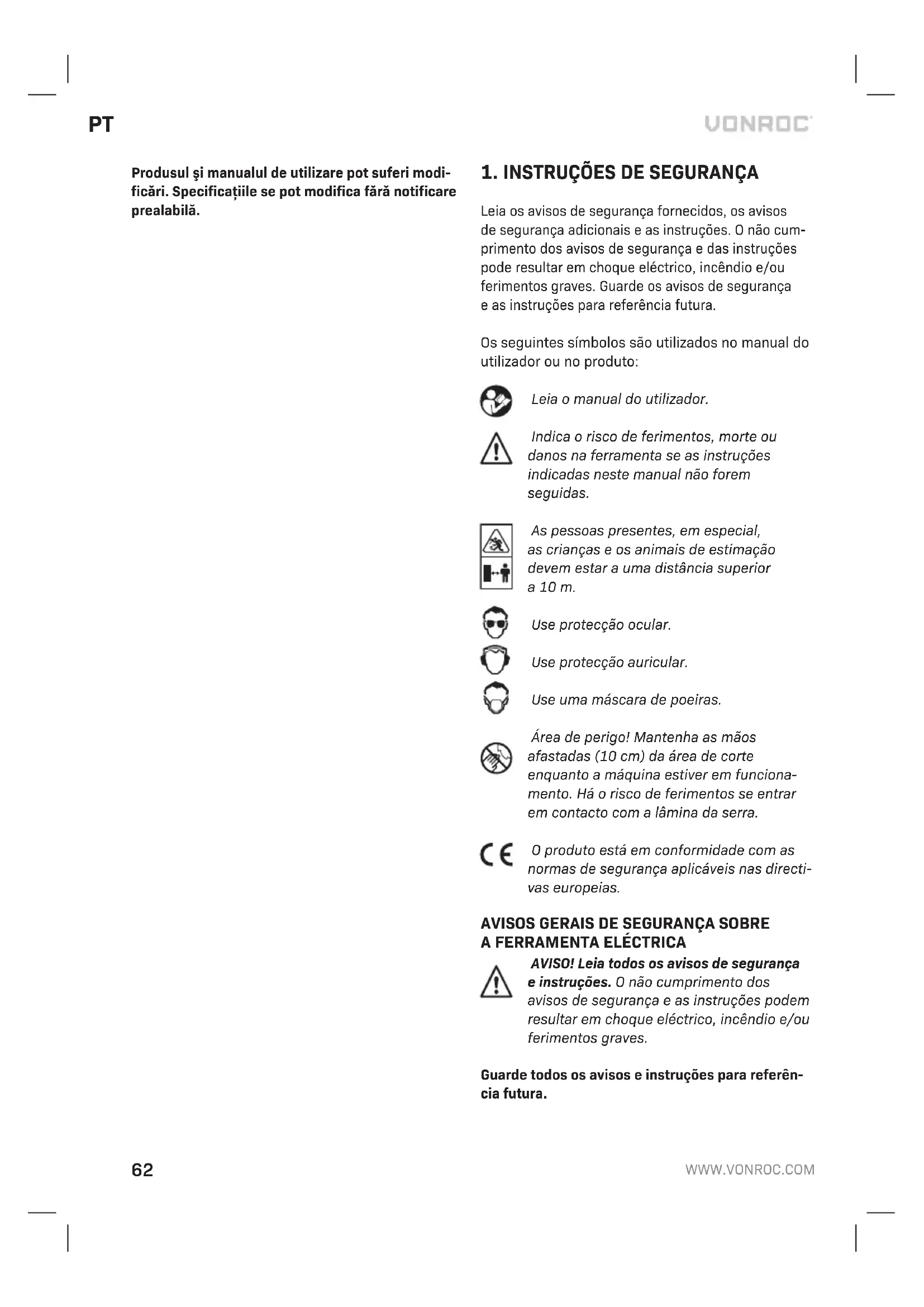 Leia os avisos de segurança fornecidos, os avisos de segurança adicionais eas instruções. Onão cum- primento dos avisos de segurança edas instruções pode resultar em choque eléctrico, incêndio e/ou ferimentos graves. Guarde os avisos de segurança eas instruções para referência futura. Os seguintes símbolos são utilizados no manual do utilizador ou no produto: Leia omanual do utilizador. Indica orisco de ferimentos, morte ou danos na ferramenta se as instruções indicadas neste manual não forem seguidas. As pessoas presentes, em especial, as crianças e os animais de estimação devem estar auma distância superior a10 m. Use protecção ocular. Use protecção auricular. Use uma máscara de poeiras. Área de perigo! Mantenha as mãos afastadas (10 cm) da área de corte enquanto amáquina estiver em funciona- mento. Há orisco de ferimentos se entrar em contacto com alâmina da serra. Oproduto está em conformidade com as normas de segurança aplicáveis nas directi- vas europeias.