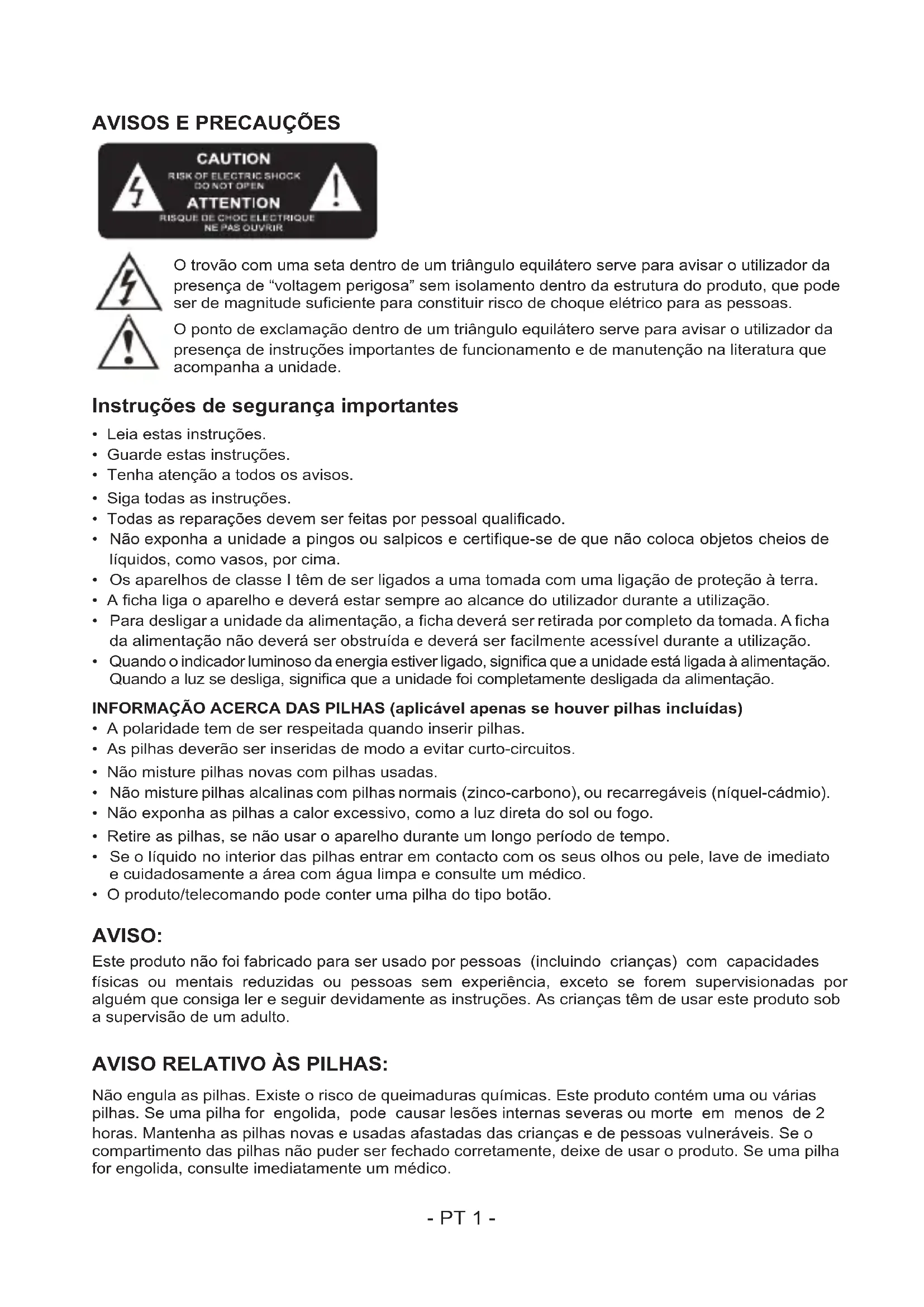 - O produto/telecomando pode conter uma pilha do tipo botão. AVISO: Este produto não foi fabricado para ser usado por pessoas (incluindo crianças) com capacidades físicas ou mentais reduzidas ou pessoas sem experiência, exceto se forem supervisionadas por alguém que consiga ler e seguir devidamente as instruções. As crianças têm de usar este produto sob a supervisão de um adulto. AVISO RELATIVO ÀS PILHAS: Não engula as pilhas. Existe o risco de queimaduras químicas. Este produto contém uma ou várias pilhas. Se uma pilha for engolida, pode causar lesões internas severas ou morte em menos de 2 horas. Mantenha as pilhas novas e usadas afastadas das crianças e de pessoas vulneráveis. Se o compartimento das pilhas não puder ser fechado corretamente, deixe de usar o produto. Se uma pilha for engolida, consulte imediatamente um médico.- PT 2 - OBSERVAÇÕES IMPORTANTES: Existe o risco de explosão se as pilhas não forem substituídas corretamente, ou se o produto não for usado durante um longo período de tempo com as pilhas no interior. Substitua as pilhas antigas por umas idênticas. duplo isolamento corrente direta corrente alternada Símbolo de utilização no interior Cuidados com o ambiente O seu produto foi criado e fabricado com materiais e componentes de alta qualidade, que podem ser reciclados e reutilizados. Quando este símbolo de um caixote do lixo com uma cruz vier no produto, significa que o produto é abrangido pela Diretiva Europeia 2002/96/CE. Por favor, informe-se acerca do sistema de recolha em separado para produtos elétricos e eletrónicos. Aja de acordo com as regras locais e não elimine o seu produto antigo juntamente com o lixo doméstico comum. A eliminação correta do seu velho produto ajuda a prevenir potenciais consequências negativas para o ambiente e para a saúde humana. Conformidade Este produto encontra-se em conformidade com os requisitos das interferências de rádio da União Europeia. Alimentação a pilhas