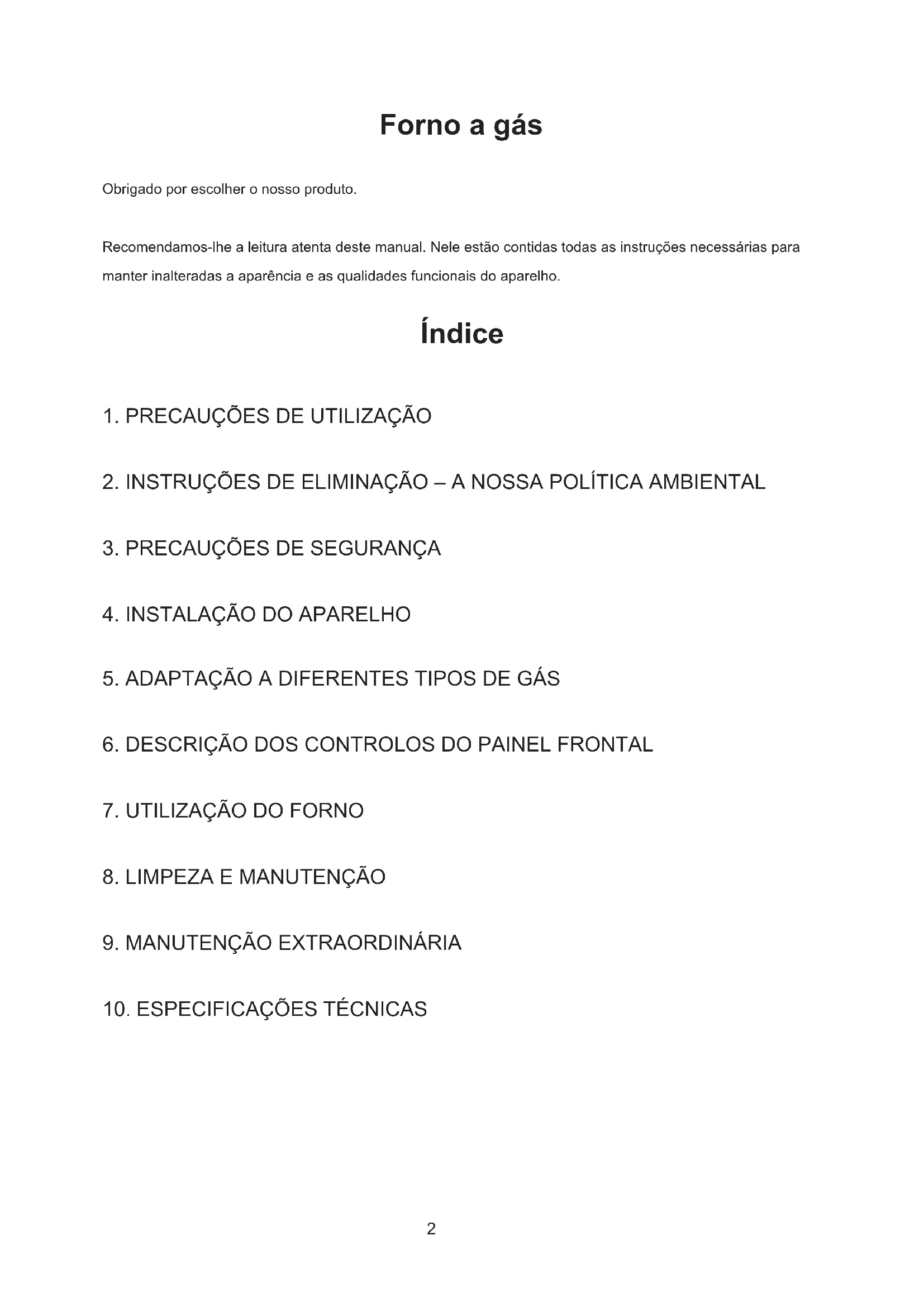 PT2 Forno a gás Obrigado por escolher o nosso produto. Recomendamos-lhe a leitura atenta deste manual. Nele estão contidas todas as instruções necessárias para manter inalteradas a aparência e as qualidades funcionais do aparelho. Índice