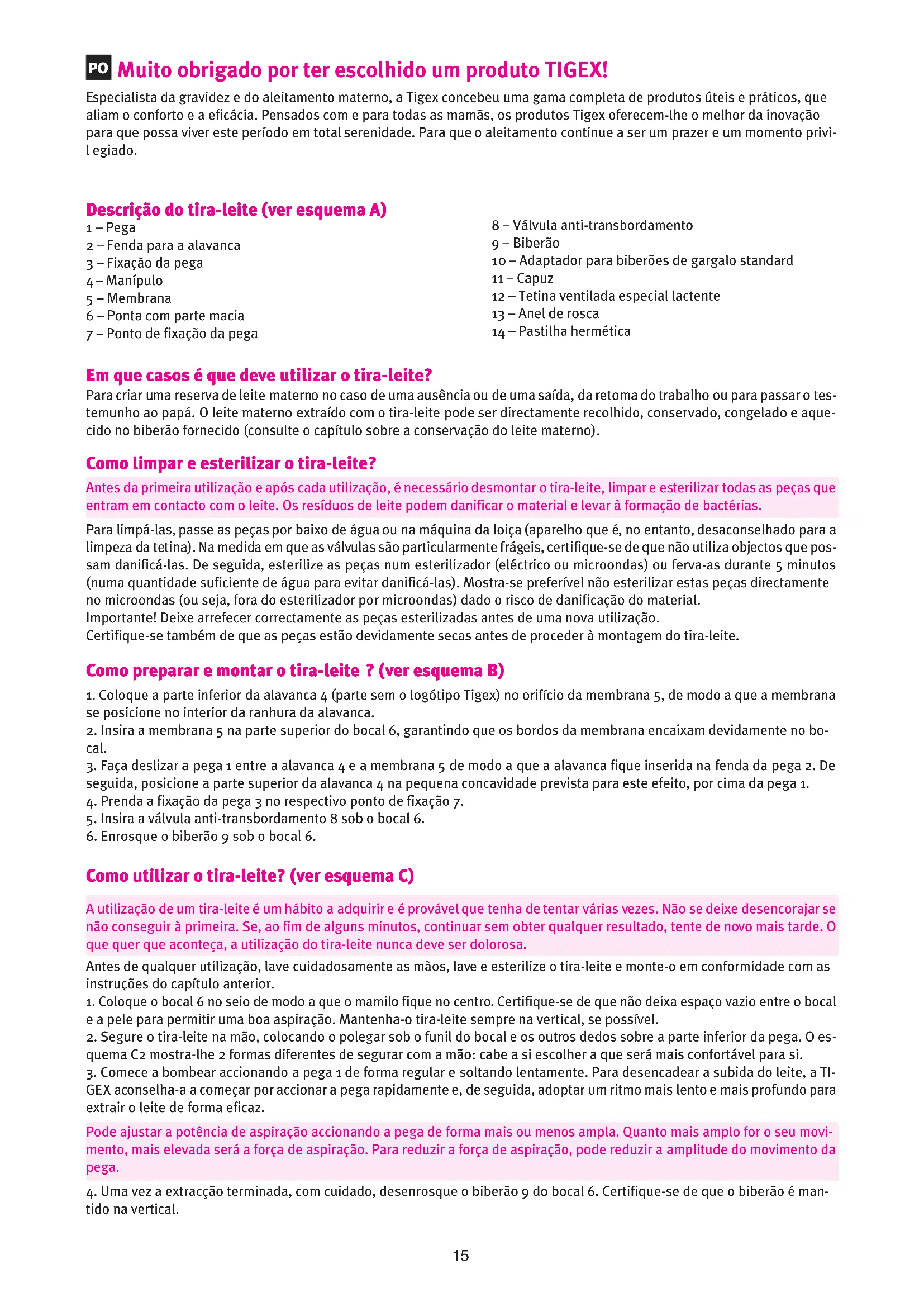 empo. A Tigex aconselha a utilização das conchas de aleitamento. Ao colocar no outro peito durante a utilização do tira- leite, permitem recolher e, de seguida, conservar o leite que escoa. Certifique-se previamente de que procede à sua esterili- zação antes de utilizar e de que transfere o leite recolhido de imediato. - Consegui extrair o leite mas o bebé recusa-se a mamar, o que devo fazer? A primeira coisa a fazer é manter-se calma e descontraída, e não insistir por demasiado tempo no caso de recusa, 10 minu- tos no máximo de cada vez. Para ajudar o bebé a manter as suas referências, dê o biberão aquecido a 37 °C e passe a tetina por água quente. Saiba que começar com o leite materno é uma vantagem: deste modo, a criança reconhece o gosto e o odor, e isso tranquiliza-a. Por último, como o bebé a associa ao seio, pode tentar dar o biberão numa posição diferente da utilizada para o aleitamento para não a perturbar demasiado. E se o bebé continuar a recusar o biberão, passe o testemunho ao pai ou a uma terceira pes- soa. - O meu tira-leite não funciona correctamente? Se a aspiração não for eficaz, verifique a montagem correcta do tira-leite (ver esquema B), e o estado dos elementos que permitem assegurar uma boa estanquicidade: a membrana 5 e a válvula 8. No caso de perda ou de deterioração, contacte o serviço do consumidor TIGEX para solicitar a sua substituição. Verifique também se o bocal está correctamente posicionado no peito, sem que exista espaço vazio entre o bocal e a pele. Por último, tenha em conta que a válvula 8 deixa de funcionar quando o biberão está demasiado cheio e fica em contacto com o leite extraído. É, então, necessário substituir o biberão. Instruções de segurança importantes - Se o leite materno se destinar a um prematuro, respeite com cuidado as instruções do seu médico. - Este aparelho não foi concebido para ser utilizado por indivíduos (in- cluindo crianças) cujas capacidades físicas, sensoriais ou mentais estão diminuídas ou por indivíduos sem experiência ou conhecimentos, ex- cepto no caso de poderem beneficiar, pelo intermédio da pessoa res- ponsável pela sua segurança, de vigilância ou instruções referentes à utilização do aparelho. - Mostra-se adequado vigiar as crianças para garantir que estas não brin- cam com o aparelho. - Utilize o tira-leite manual Skin Touch apenas para a utilização prevista e descrita neste modo de utilização. - Se observar reacções imprevistas, consulte a sua parteira, profissional do aleitamento ou médico. - Não exponha o aparelho aos raios directos do sol, dado que a radiação UV e o sobreaquecimento podem provocar uma fragilização dos mate- riais plásticos. - Elimine as pomadas com elementos gordos antes de extrair leite porque podem danificar a superfície do bocal. - Mantenha as pequenas peças fora do alcance das crianças: risco de in- gestão. - A tetina e o biberão fornecidos estão em conformidade com a norma EN 14350 Precauções de utilização - Biberões e tetinas Precauções e limpeza: