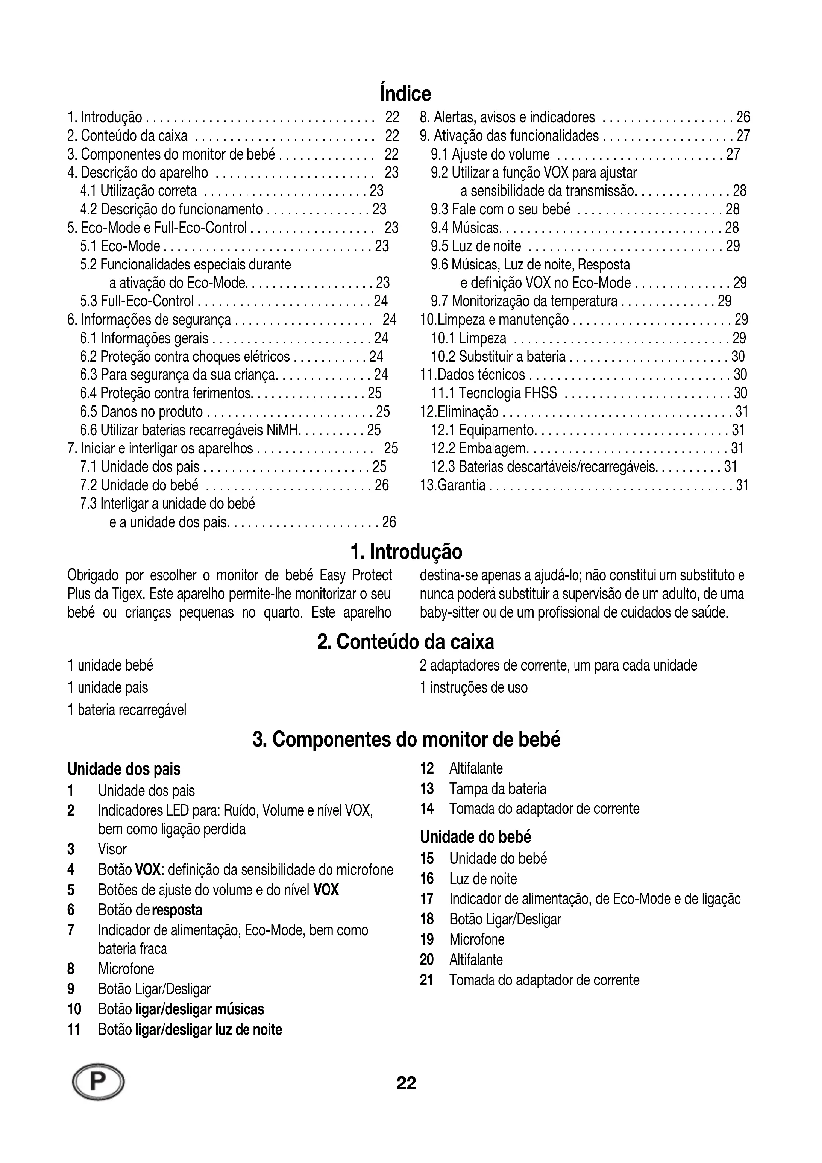 Obrigado por escolher o monitor de bebé Easy Protect Plus da Tigex. Este aparelho permite-lhe monitorizar o seu bebé ou crianças pequenas no quarto. Este aparelho destina-se apenas a ajudá-lo; não constitui um substituto e nunca poderá substituir a supervisão de um adulto, de uma baby-sitter ou de um profissional de cuidados de saúde.