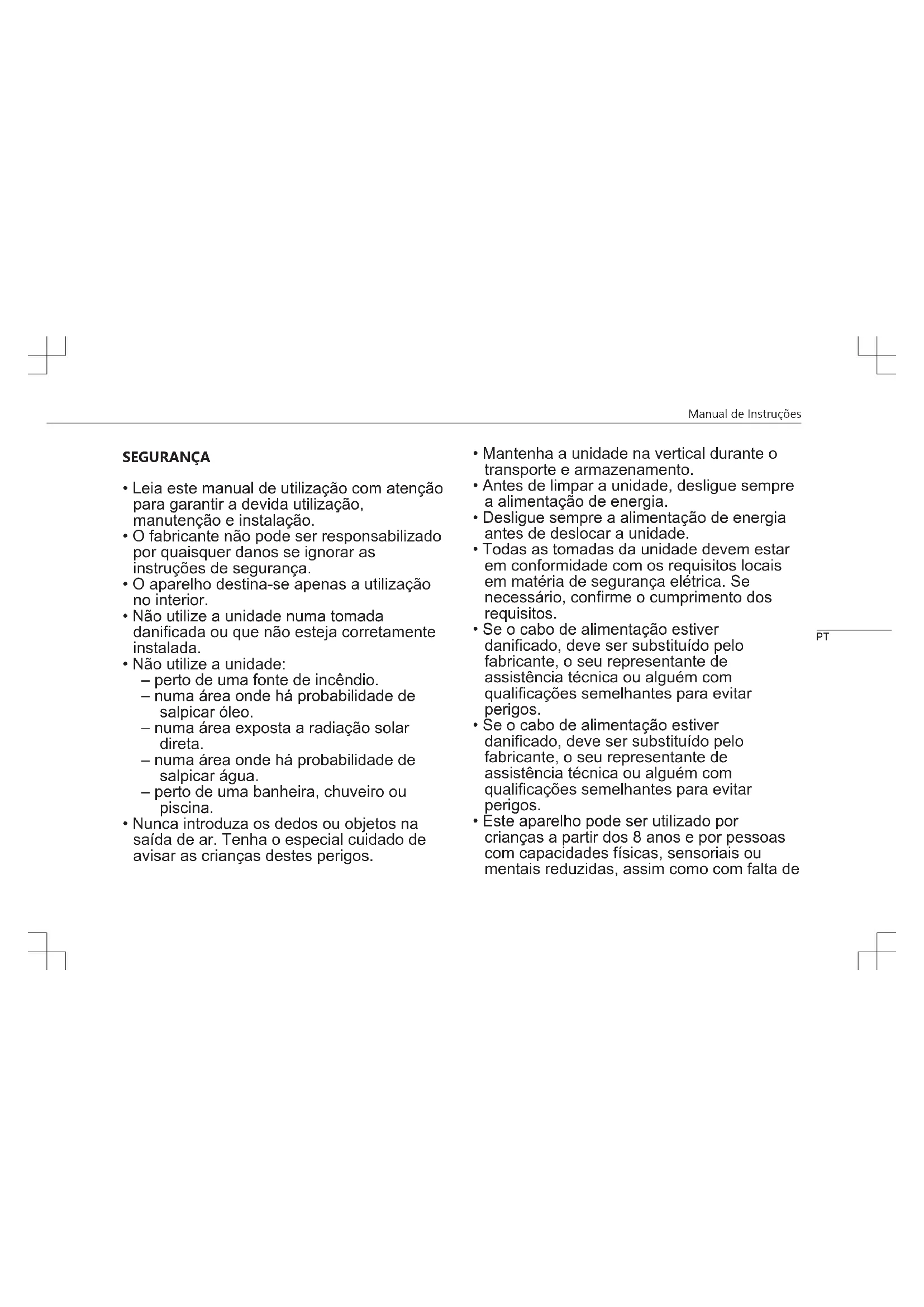 - Este aparelho pode ser utilizado por crianças a partir dos 8 anos e por pessoas com capacidades físicas, sensoriais ou mentais reduzidas, assim como com falta de PTManual de Instruções experiência e conhecimentos, caso sejam supervisionadas ou instruídas sobre como utilizar o aparelho de modo seguro e compreendam os riscos envolvidos. As crianças não devem brincar com o aparelho. A limpeza e manutenção pelo utilizador não devem ser realizadas por crianças sem supervisão.