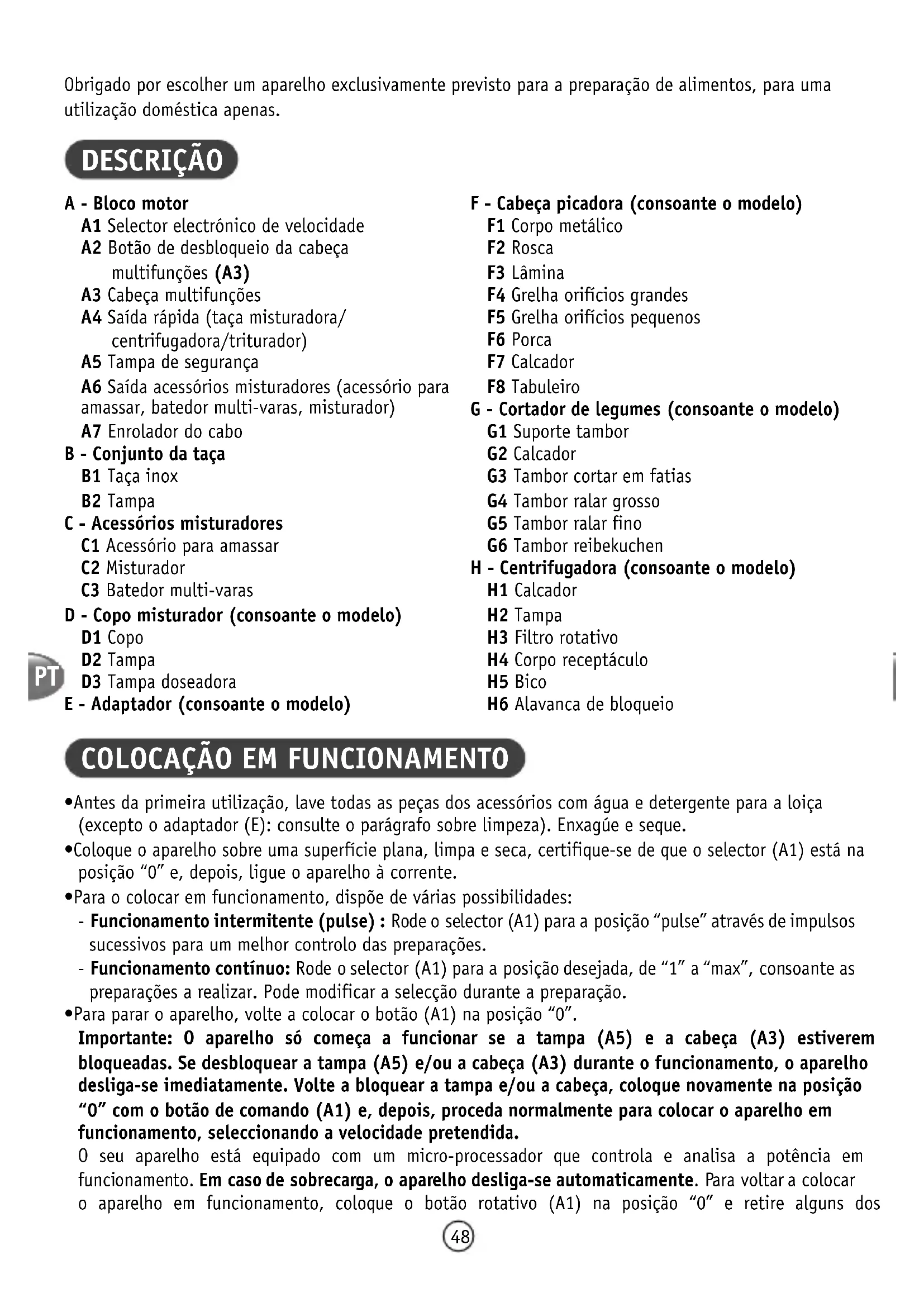 MASTERCHEF-GOURM-8080013820 07/07/14 14:00 Page4748 DESCRIÇÃO A - Bloco motor A1 Selector electrónico de velocidade A2 Botão de desbloqueio da cabeça multifunções (A3) A3 Cabeça multifunções A4 Saída rápida (taça misturadora/ centrifugadora/triturador) A5 Tampa de segurança A6 Saída acessórios misturadores (acessório para amassar, batedor multi-varas, misturador) A7 Enrolador do cabo B - Conjunto da taça B1 Taça inox B2 Tampa C - Acessórios misturadores C1 Acessório para amassar C2 Misturador C3 Batedor multi-varas D - Copo misturador (consoante o modelo) D1 Copo D2 Tampa D3 Tampa doseadora E - Adaptador (consoante o modelo) F - Cabeça picadora (consoante o modelo) F1 Corpo metálico F2 Rosca F3 Lâmina F4 Grelha orifícios grandes F5 Grelha orifícios pequenos F6 Porca F7 Calcador F8 Tabuleiro G - Cortador de legumes (consoante o modelo) G1 Suporte tambor G2 Calcador G3 Tambor cortar em fatias G4 Tambor ralar grosso G5 Tambor ralar fino G6 Tambor reibekuchen H - Centrifugadora (consoante o modelo) H1 Calcador H2 Tampa H3 Filtro rotativo H4 Corpo receptáculo H5 Bico H6 Alavanca de bloqueio