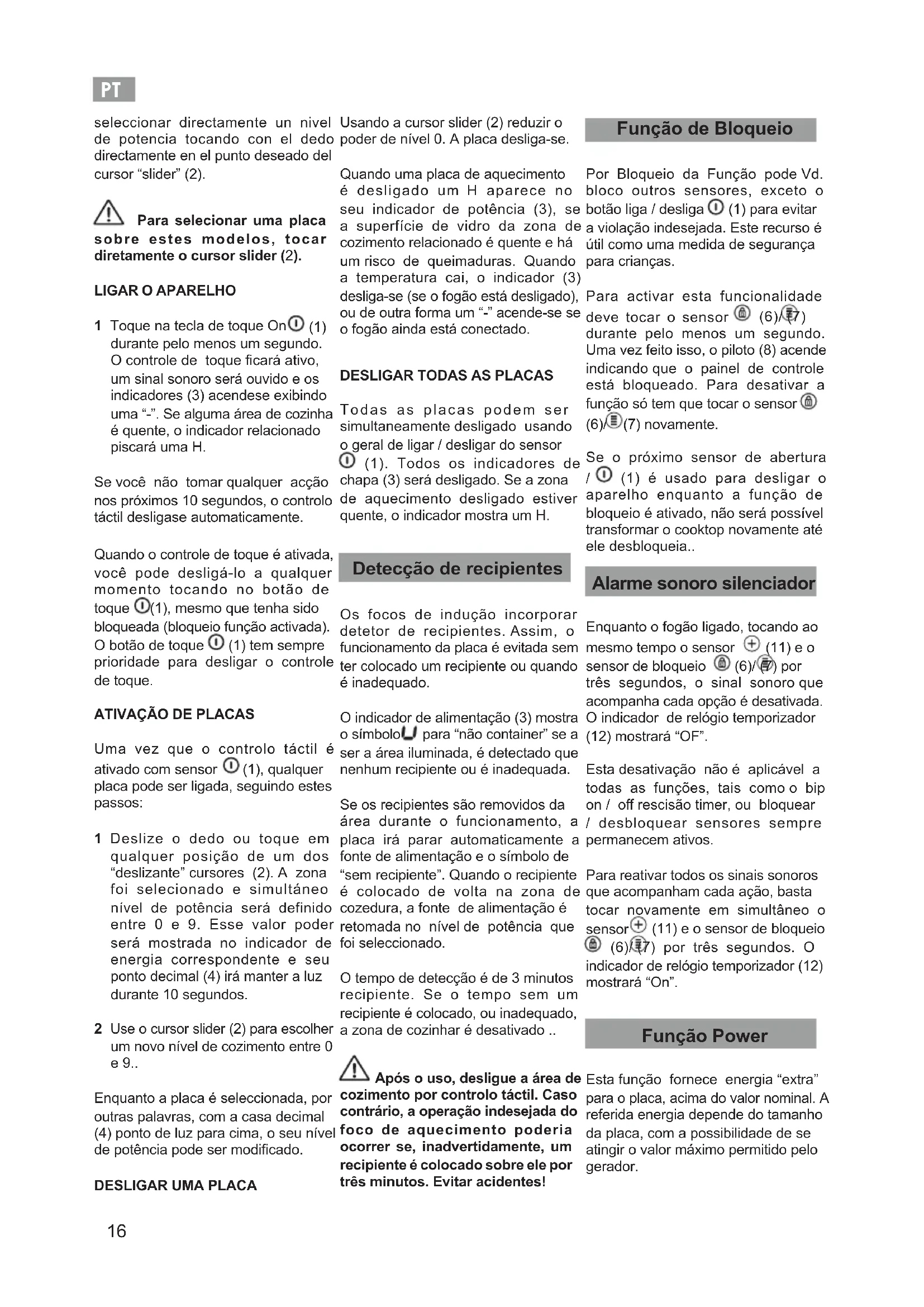 (1) é usado para desligar o aparelho enquanto a função de bloqueio é ativado, não será possível transformar o cooktop novamente até ele desbloqueia.. Alarme sonoro silenciador Enquanto o fogão ligado, tocando ao mesmo tempo o sensor (11) e o sensor de bloqueio (6)/ (7) por três segundos, o sinal sonoro que acompanha cada opção é desativada. O indicador de relógio temporizador (12) mostrará “OF”. Esta desativação não é aplicável a todas as funções, tais como o bip on / o rescisão timer, ou bloquear / desbloquear sensores sempre permanecem ativos. Para reativar todos os sinais sonoros que acompanham cada ação, basta tocar novamente em simultâneo o sensor (11) e o sensor de bloqueio (6)/ (7) por três segundos. O indicador de relógio temporizador (12) mostrará “On”. Função Power Esta função fornece energia “extra” para o placa, acima do valor nominal. A referida energia depende do tamanho da placa, com a possibilidade de se atingir o valor máximo permitido pelo gerador.PT