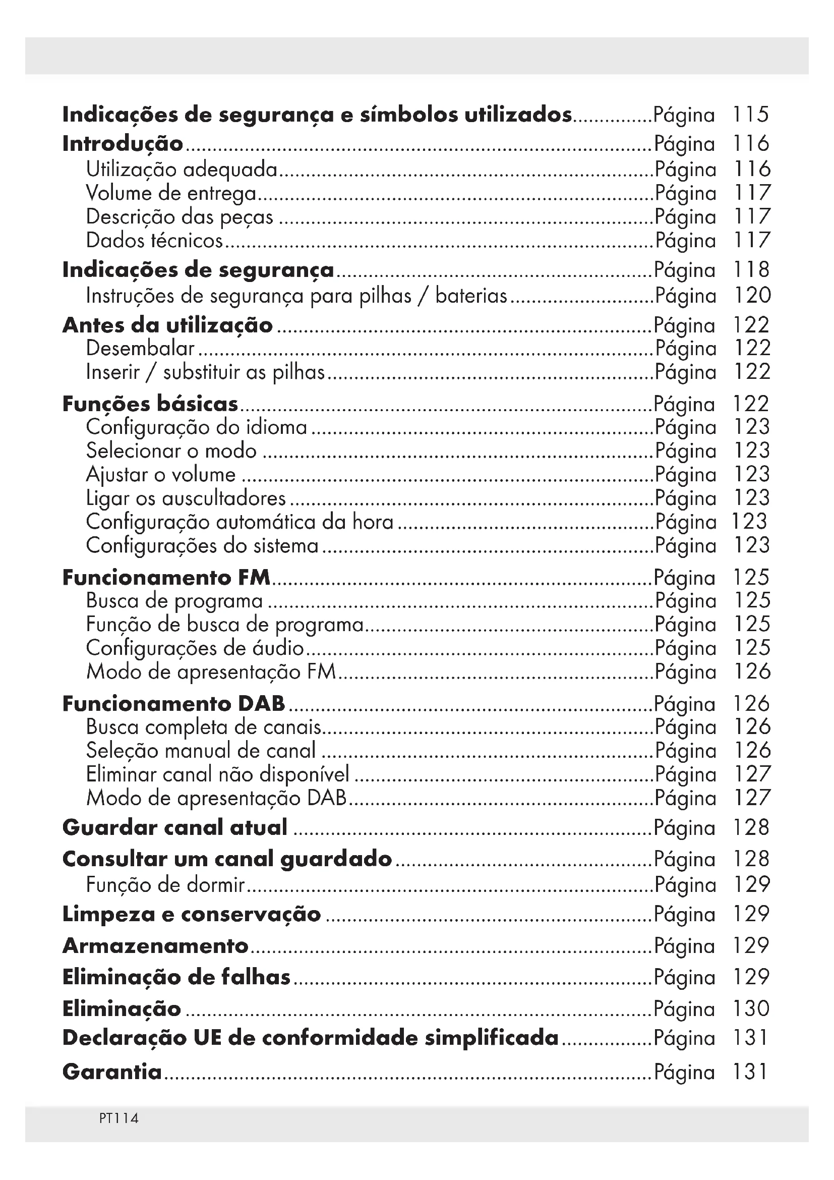 EXPLOSÃO! Este símbolo com a palavra “CUIDADO” representa um aviso! “PERIGO DE EXPLOSÃO” indica a possibi- lidade de uma situação perigosa de explosão. O incumprimento deste aviso pode provocar a morte, causar ferimentos graves ou danos materiais. Respeite as indicações deste aviso para evitar ferimentos graves, perigo de morte ou o risco de danos materiais! Este sinal indica que deve utilizar luvas de proteção adequadas! Respeite as indicações para evitar o contacto de materiais térmicos e químicos com as suas mãos! Quando o volume estiver muito alto durante longos períodos de tempo pode causar danos auditivos. Antes de utilizar o produto ajuste o volume para um nível mais baixo.PT 117 Volume de entrega Ao abrir o produto, verifique a integri- dade do conteúdo e a existência de eventuais danos de todas as peças. Elimine todo o material de embala- gem antes da utilização. 1 Rádio digital 1 Fonte de energia 1 Manual de instruções Descrição das peças
