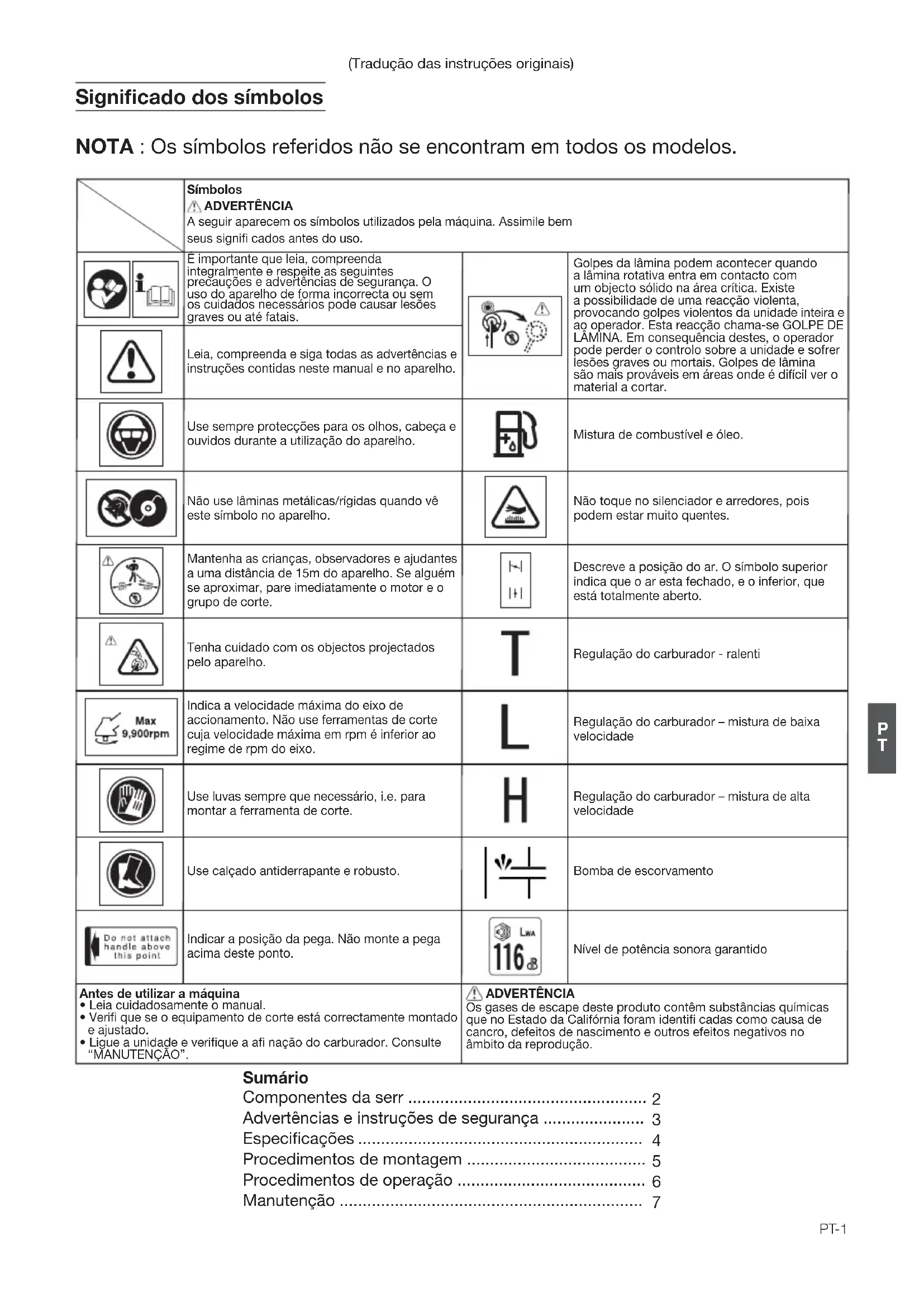 - Ligue a unidade e verifique a afi nação do carburador. Consulte “MANUTENÇÃO”. Símbolos ADVERTÊNCIA A seguir aparecem os símbolos utilizados pela máquina. Assimile bem seus signifi cados antes do uso. (Tradução das instruções originais) ADVERTÊNCIA Os gases de escape deste produto contêm substâncias químicas que no Estado da Califórnia foram identifi cadas como causa de cancro, defeitos de nascimento e outros efeitos negativos no âmbito da reprodução. Mistura de combustível e óleo. Não toque no silenciador e arredores, pois podem estar muito quentes. Descreve a posição do ar. O símbolo superior indica que o ar esta fechado, e o inferior, que está totalmente aberto. Regulação do carburador - ralenti Regulação do carburador – mistura de baixa velocidade Regulação do carburador – mistura de alta velocidade Bomba de escorvamento Nível de potência sonora garantidoPT-2