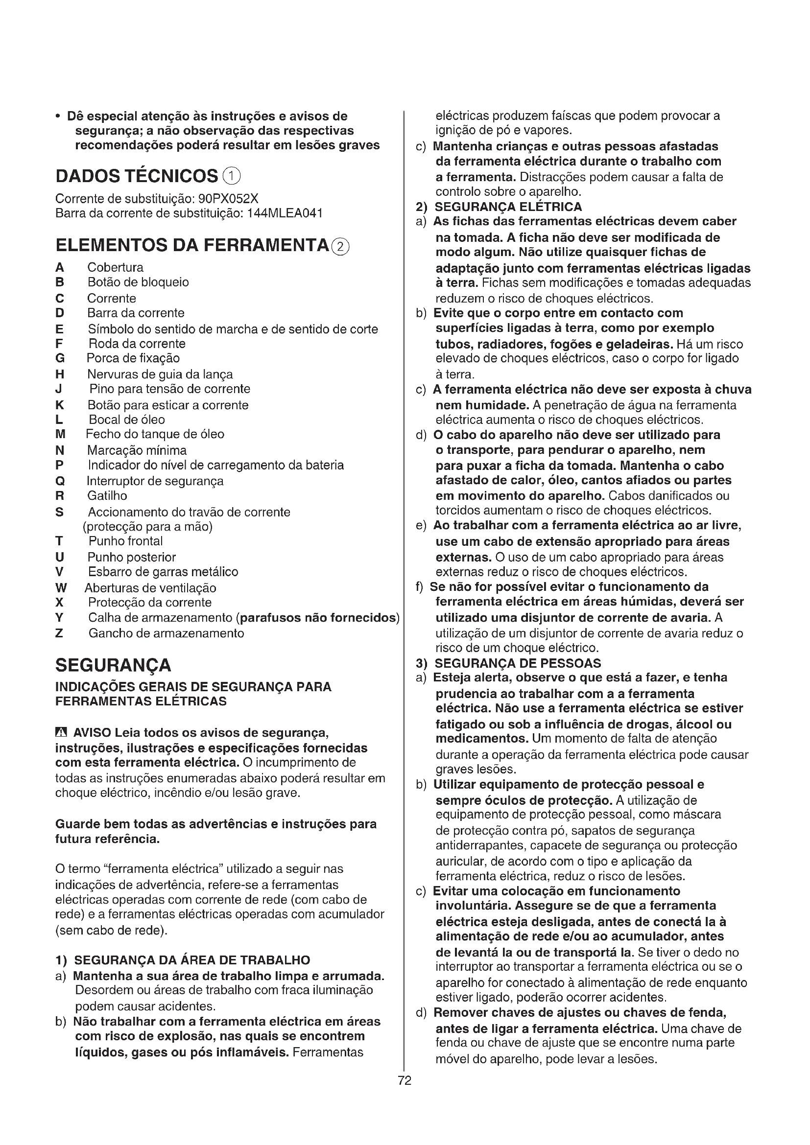 A Cobertura B Botão de bloqueio C Corrente D Barra da corrente E Símbolo do sentido de marcha e de sentido de corte F Roda da corrente G Porca de xação H Nervuras de guia da lança J Pino para tensão de corrente K Botão para esticar a corrente L Bocal de óleo M Fecho do tanque de óleo N Marcação mínima P Indicador do nível de carregamento da bateria Q Interruptor de segurança R Gatilho S Accionamento do travão de corrente (protecção para a mão) T Punho frontal U Punho posterior V Esbarro de garras metálico W Aberturas de ventilação X Protecção da corrente Y Calha de armazenamento (parafusos não fornecidos) Z Gancho de armazenamento SEGURANÇA INDICAÇÕES GERAIS DE SEGURANÇA PARA