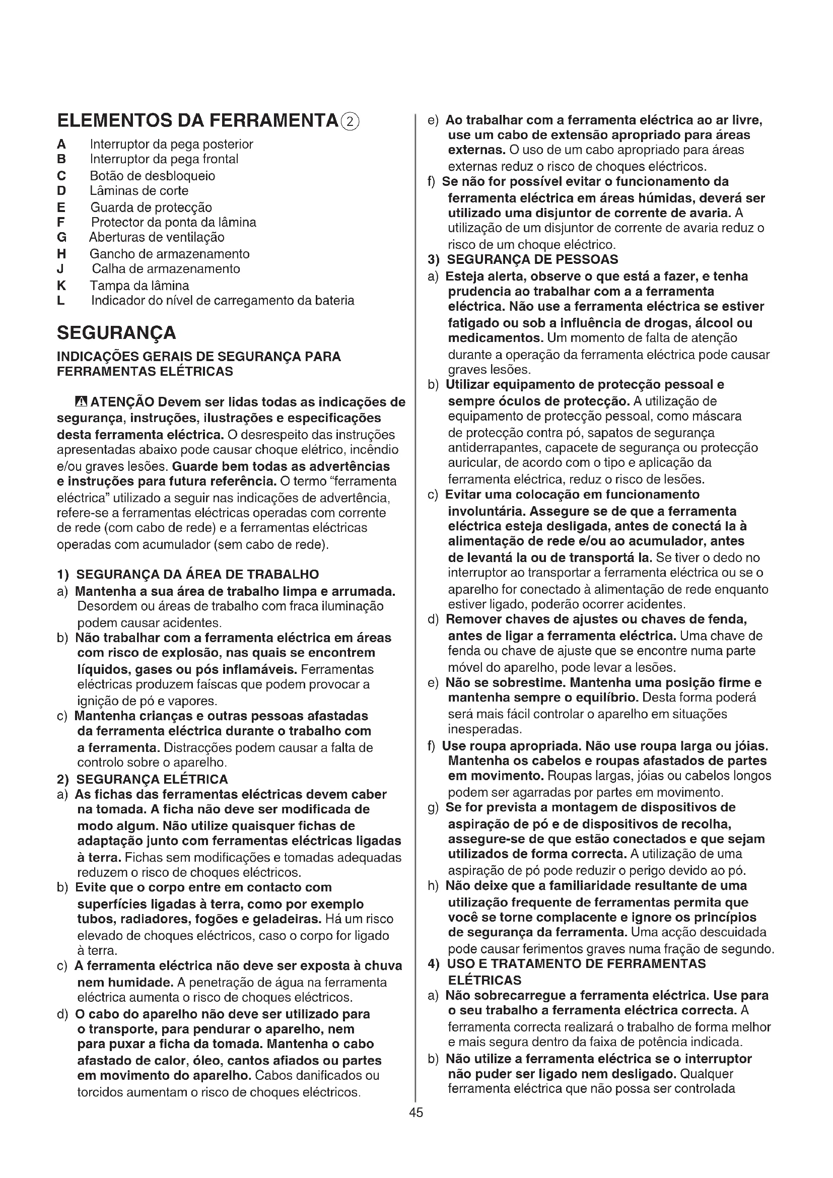 A Interruptor da pega posterior B Interruptor da pega frontal C Botão de desbloqueio D Lâminas de corte E Guarda de protecção F Protector da ponta da lâmina G Aberturas de ventilação H Gancho de armazenamento J Calha de armazenamento K Tampa da lâmina L Indicador do nível de carregamento da bateria SEGURANÇA INDICAÇÕES GERAIS DE SEGURANÇA PARA