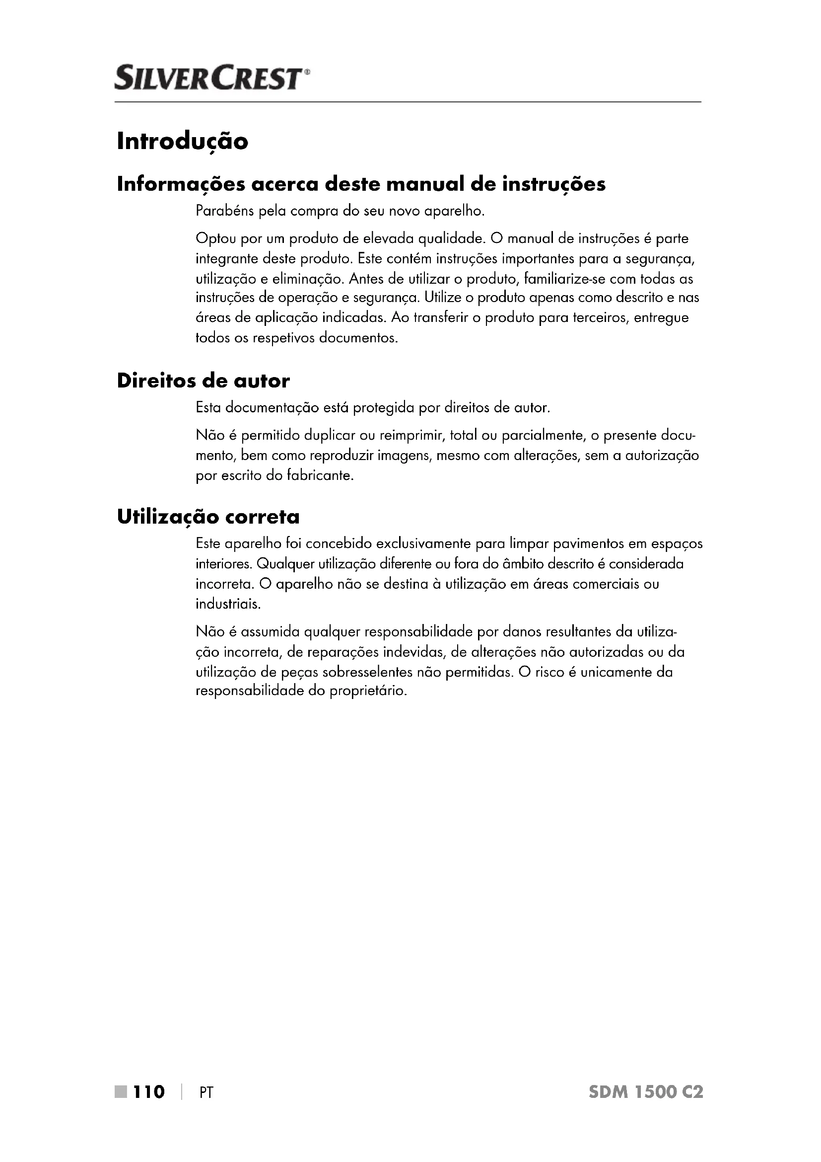 PT SDM 1500 C2 Introdução Informações acerca deste manual de instruções Parabéns pela compra do seu novo aparelho. Optou por um produto de elevada qualidade. O manual de instruções é parte integrante deste produto. Este contém instruções importantes para a segurança, utilização e eliminação. Antes de utilizar o produto, familiarize-se com todas as instruções de operação e segurança. Utilize o produto apenas como descrito e nas áreas de aplicação indicadas. Ao transferir o produto para terceiros, entregue todos os respetivos documentos. Direitos de autor Esta documentação está protegida por direitos de autor. Não é permitido duplicar ou reimprimir, total ou parcialmente, o presente docu- mento, bem como reproduzir imagens, mesmo com alterações, sem a autorização por escrito do fabricante. Utilização correta Este aparelho foi concebido exclusivamente para limpar pavimentos em espaços interiores. Qualquer utilização diferente ou fora do âmbito descrito é considerada incorreta. O aparelho não se destina à utilização em áreas comerciais ou industriais. Não é assumida qualquer responsabilidade por danos resultantes da utiliza- ção incorreta, de reparações indevidas, de alterações não autorizadas ou da utilização de peças sobresselentes não permitidas. O risco é unicamente da responsabilidade do proprietário.PT