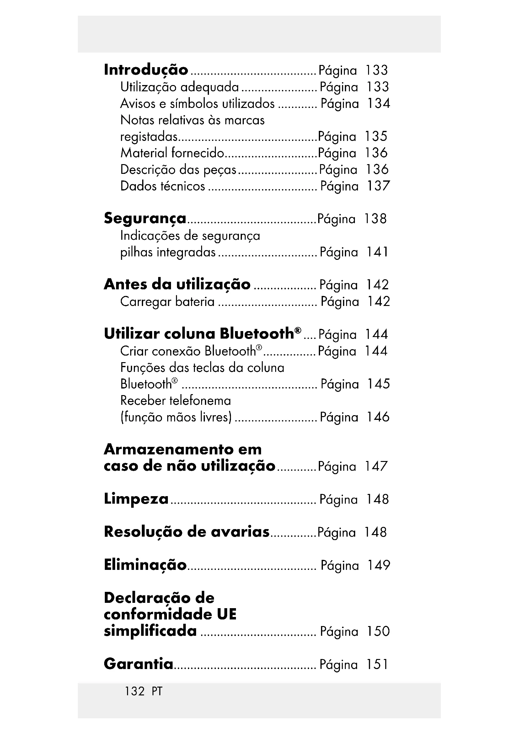 ......................................... Página 145 Receber telefonema (função mãos livres) ......................... Página 146 Armazenamento em caso de não utilização ............ Página 147 Limpeza ............................................ Página 148 Resolução de avarias .............. Página 148 Eliminação....................................... Página 149 Declaração de conformidade UE simplificada ................................... Página 150 Garantia ........................................... Página 151133 PT Altifalantes Bluetooth