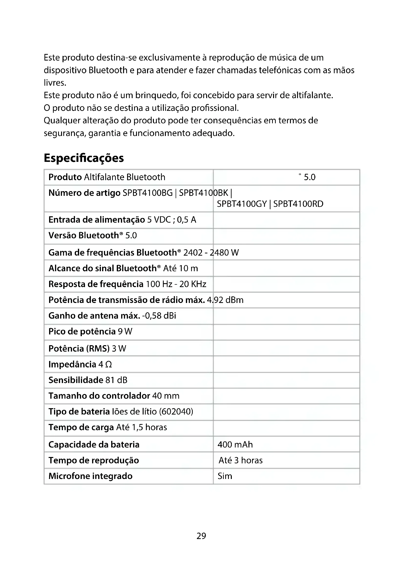 Para mais informações, consulte a versão alargada do manual on-line: ned.is/spbt4100bg | ned.is/spbt4100bk ned.is/spbt4100gy | ned.is/spbt4100rd Utilização prevista O SPBT4100BG | SPBT4100BK | SPBT4100GY | SPBT4100RD da Nedis é um altifalante Bluetooth que reproduz áudio a partir do seu dispositivo multimédia.29 Este produto destina-se exclusivamente à reprodução de música de um dispositivo Bluetooth e para atender e fazer chamadas telefónicas com as mãos livres. Este produto não é um brinquedo, foi concebido para servir de altifalante. O produto não se destina a utilização prossional. Qualquer alteração do produto pode ter consequências em termos de segurança, garantia e funcionamento adequado. Especicações Produto Altifalante Bluetooth