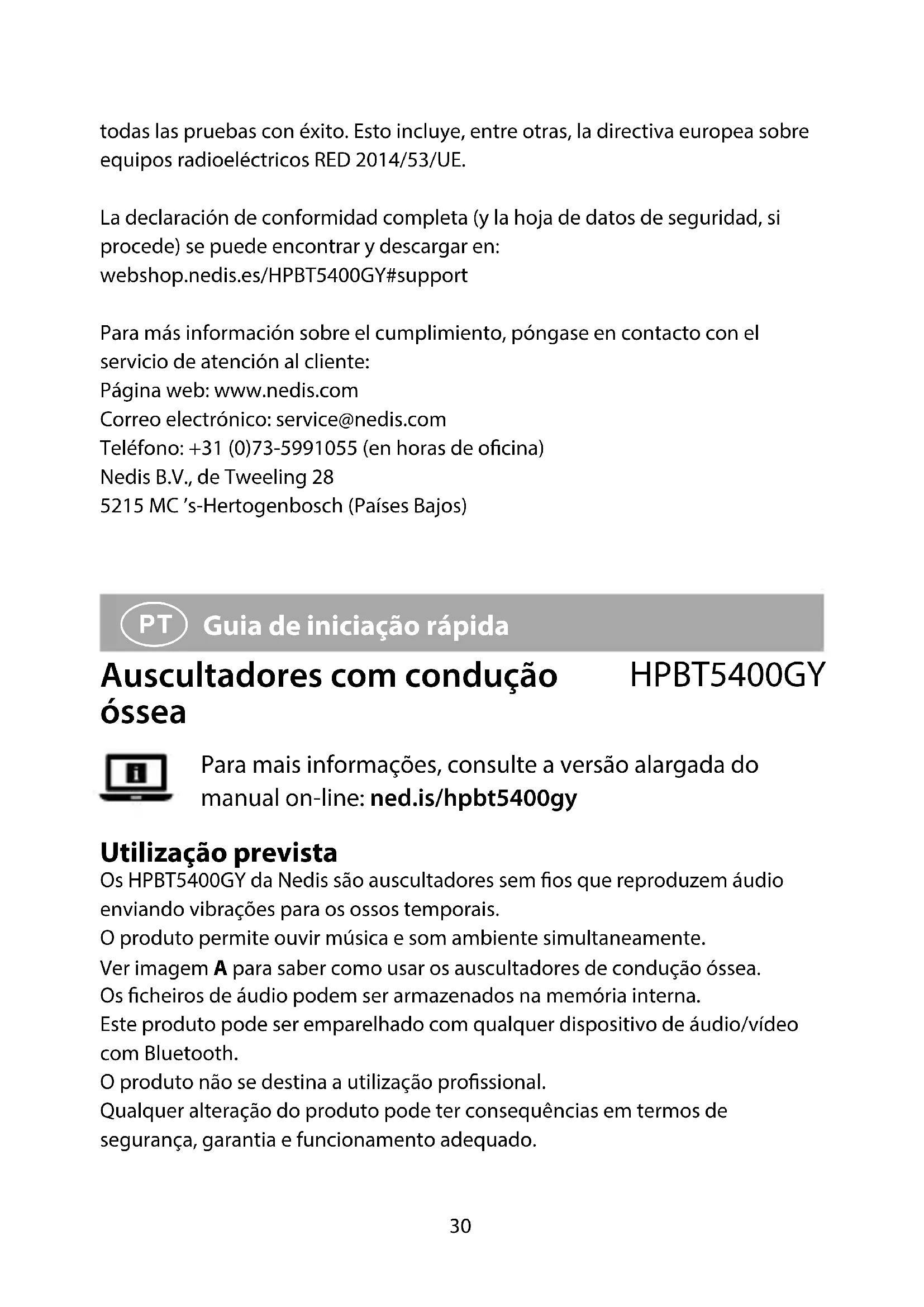 Guia de iniciação rápida Auscultadores com condução óssea HPBT5400GY Para mais informações, consulte a versão alargada do manual on-line: ned.is/hpbt5400gy Utilização prevista Os HPBT5400GY da Nedis são auscultadores sem os que reproduzem áudio enviando vibrações para os ossos temporais. O produto permite ouvir música e som ambiente simultaneamente. Ver imagem A para saber como usar os auscultadores de condução óssea. Os cheiros de áudio podem ser armazenados na memória interna. Este produto pode ser emparelhado com qualquer dispositivo de áudio/vídeo com Bluetooth. O produto não se destina a utilização prossional. Qualquer alteração do produto pode ter consequências em termos de segurança, garantia e funcionamento adequado.31 Especicações Produto Auscultadores com condução óssea Número de artigo HPBT5400GY Peso 36 g Versão Bluetooth® 5.0 Gama de frequências Bluetooth® 2403 - 2480 MHz Potência de transmissão de rádio máx. 2 dBm Distância de transmissão Até 10 m (sem obstáculos) Resposta de frequência 20 - 20000 Hz Impedância 8 Ω Tipo de bateria Iões de lítio Capacidade da bateria 180 mAh Recarregável Sim Tempo de carga Até 2 horas Tempo de reprodução Até 4.5 horas Capacidade de armazenamento 8 GB Entrada de alimentação 5 VDC ; 1 A Peças principais (imagem A)
