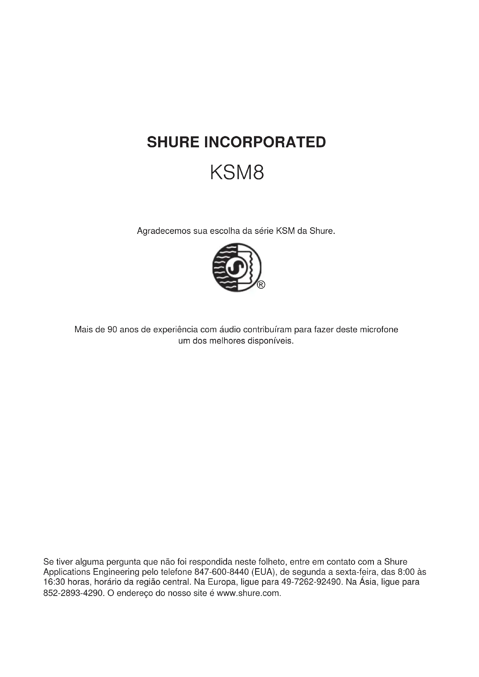 Mais de 90 anos de experiência com áudio contribuíram para fazer deste microfone um dos melhores disponíveis. Se tiver alguma pergunta que não foi respondida neste folheto, entre em contato com a Shure Applications Engineering pelo telefone 847-600-8440 (EUA), de segunda a sexta-feira, das 8:00 às 16:30 horas, horário da região central. Na Europa, ligue para 49-7262-92490. Na Ásia, ligue para 852-2893-4290. O endereço do nosso site é www.shure.com.32 Microfone KSM8 Dualdyne™ Descrição Geral O Microfone KSM8 Dualdyne™ da Shure é o primeiro microfone de mão dinâmico de diafragma duplo do mundo, projetado para aplicações vocais profissionais em ambientes de estúdio e de som ao vivo. A Shure estabeleceu novos níveis para a tecnologia e o desempenho de microfones dinâmicos com o desenvolvimento do excelente KSM8 Dualdyne. Por obter um maior nível de saída e minimizar o efeito de proximidade de forma nunca vista antes, o microfone oferece um sinal limpo e rico em detalhes, com o mínimo de realimentação. Com fabricação de última geração e componentes de ponta, cada KSM8 Dualdyne é minuciosamente testado para garantir os altos padrões de qualidade da Shure, mesmo nos ambientes ao vivo mais exigentes. Variações do Modelo O microfone KSM8 está disponível com acabamento em preto ou em níquel escovado. Ele também pode ser adquirido como parte de um sistema sem fio da Shure ou como atualização para um transmissor manual sem fio existente. KSM8/B: Excelente microfone dinâmico de diafragma duplo com acabamento em preto. KSM8/N: Excelente microfone dinâmico de diafragma duplo com acabamento em níquel escovado. Recursos Esta cápsula de diafragma duplo fornece maior consistência ao longo do espectro de frequência conforme muda a distância entre o microfone e a fonte. Esta revolucionária tecnologia oferece os seguintes benefícios: