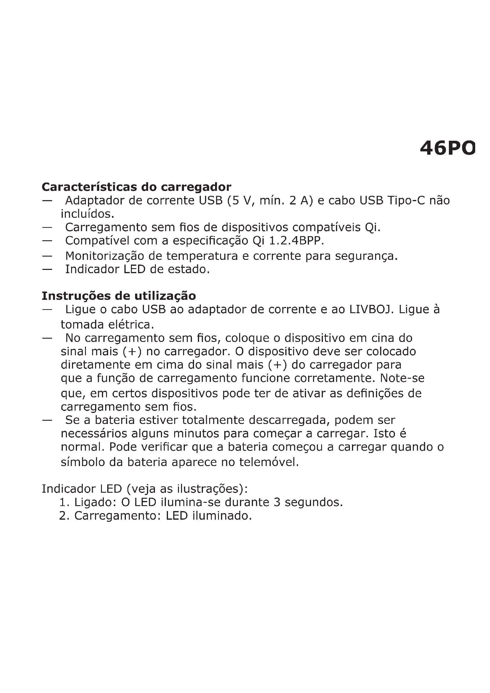 Características do carregador — Adaptador de corrente USB (5 V, mín. 2 A) e cabo USB Tipo-C não incluídos. — Carregamento sem os de dispositivos compatíveis Qi. — Compatível com a especicação Qi 1.2.4BPP. — Monitorização de temperatura e corrente para segurança. — Indicador LED de estado. Instruções de utilização — Ligue o cabo USB ao adaptador de corrente e ao LIVBOJ. Ligue à tomada elétrica. — No carregamento sem os, coloque o dispositivo em cina do sinal mais (+) no carregador. O dispositivo deve ser colocado diretamente em cima do sinal mais (+) do carregador para que a função de carregamento funcione corretamente. Note-se que, em certos dispositivos pode ter de ativar as denições de carregamento sem os. — Se a bateria estiver totalmente descarregada, podem ser necessários alguns minutos para começar a carregar. Isto é normal. Pode vericar que a bateria começou a carregar quando o símbolo da bateria aparece no telemóvel. Indicador LED (veja as ilustrações):