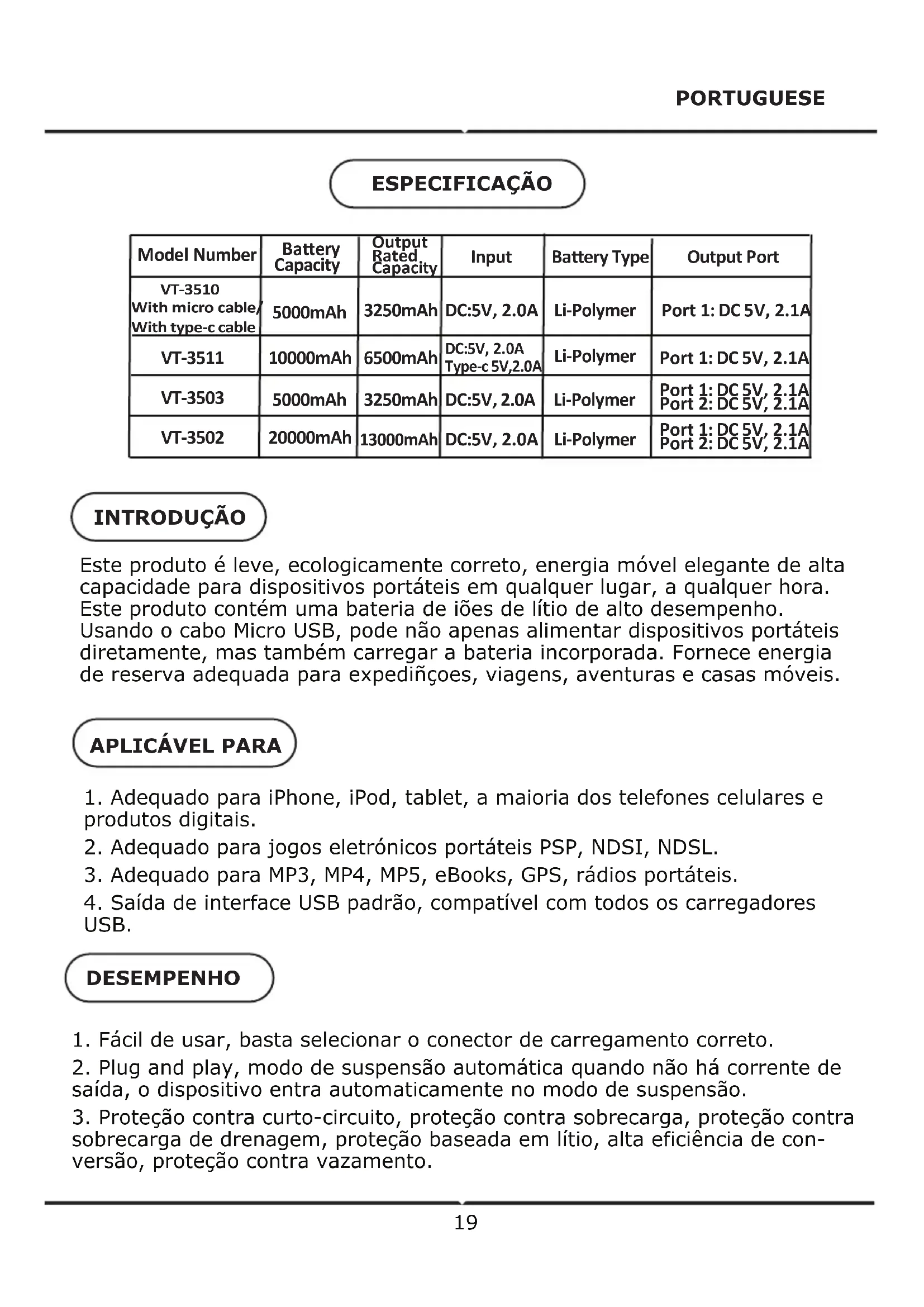 18Este produto é leve, ecologicamente correto, energia móvel elegante de alta capacidade para dispositivos portáteis em qualquer lugar, a qualquer hora. Este produto contém uma bateria de iões de lítio de alto desempenho. Usando o cabo Micro USB, pode não apenas alimentar dispositivos portáteis diretamente, mas também carregar a bateria incorporada. Fornece energia de reserva adequada para expediñçoes, viagens, aventuras e casas móveis.