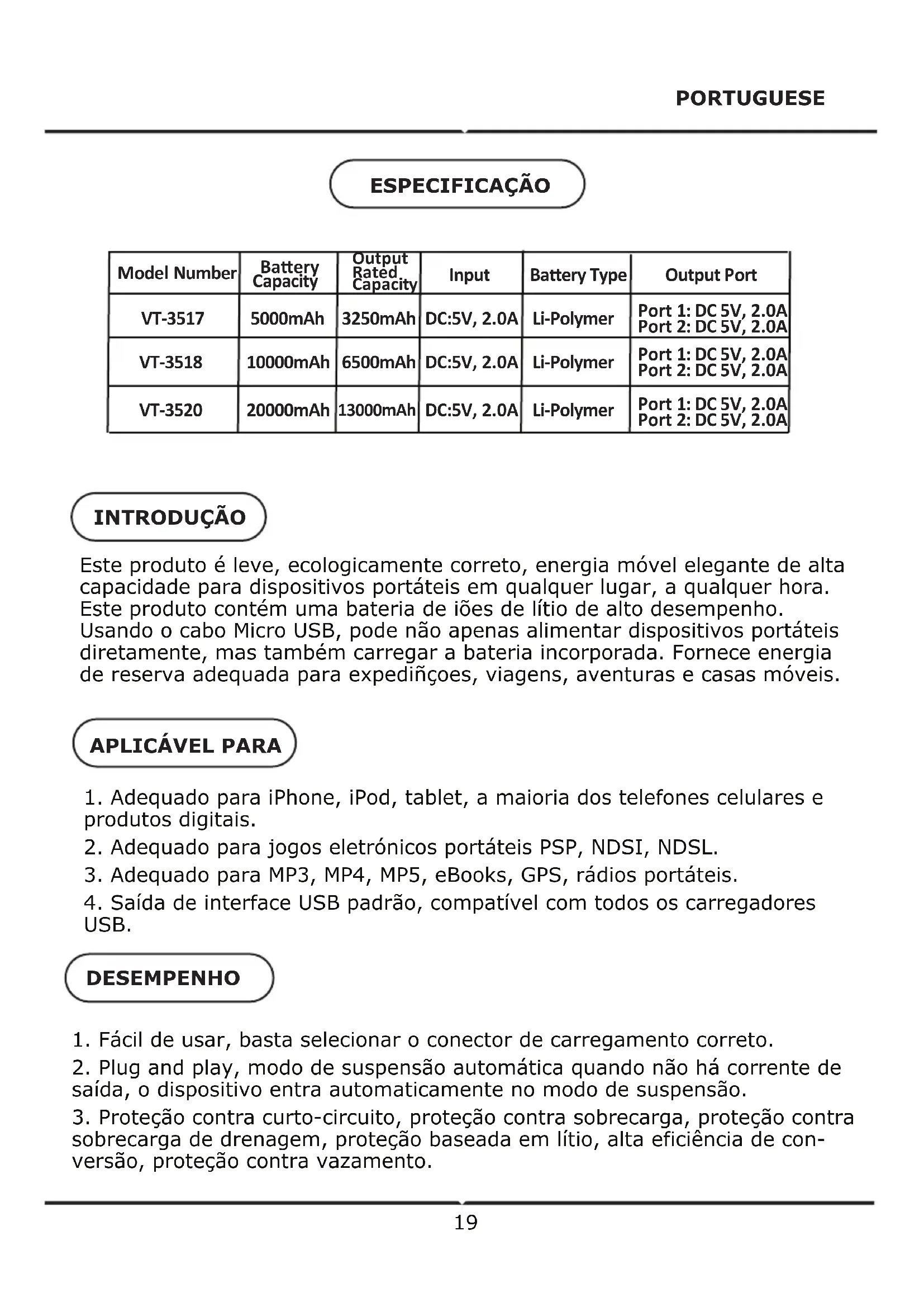 sobrecarga de drenagem, proteção baseada em lítio, alta eficiência de con- versão, proteção contra vazamento. DESEMPENHO PORTUGUESE