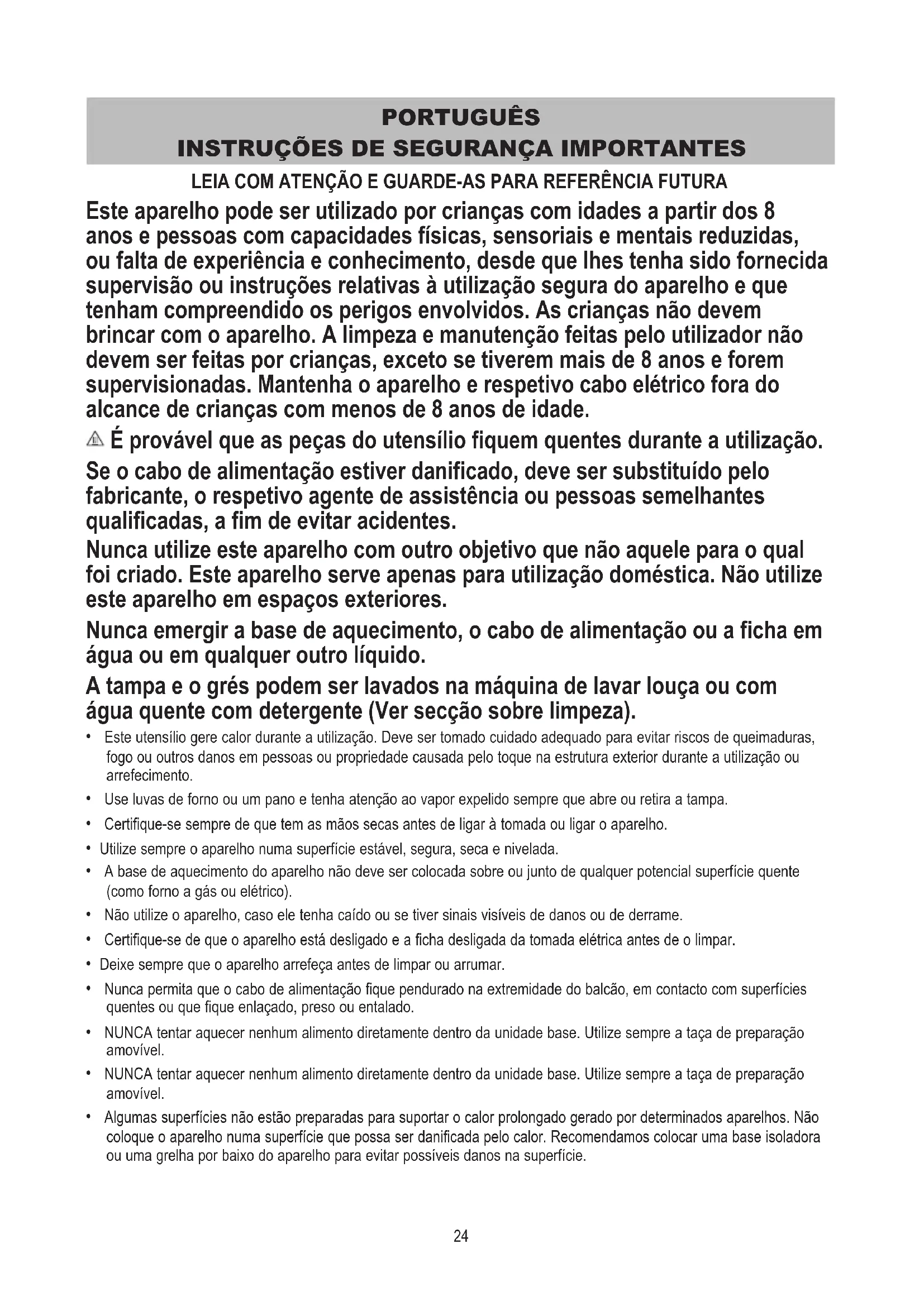 LEIA COM ATENÇÃO E GUARDE-AS PARA REFERÊNCIA FUTURA Este aparelho pode ser utilizado por crianças com idades a partir dos 8 anos e pessoas com capacidades físicas, sensoriais e mentais reduzidas, ou falta de experiência e conhecimento, desde que lhes tenha sido fornecida supervisão ou instruções relativas à utilização segura do aparelho e que tenham compreendido os perigos envolvidos. As crianças não devem brincar com o aparelho. A limpeza e manutenção feitas pelo utilizador não devem ser feitas por crianças, exceto se tiverem mais de 8 anos e forem supervisionadas. Mantenha o aparelho e respetivo cabo elétrico fora do alcance de crianças com menos de 8 anos de idade. É provável que as peças do utensílio fiquem quentes durante a utilização. Se o cabo de alimentação estiver danificado, deve ser substituído pelo fabricante, o respetivo agente de assistência ou pessoas semelhantes qualificadas, a fim de evitar acidentes. Nunca utilize este aparelho com outro objetivo que não aquele para o qual foi criado. Este aparelho serve apenas para utilização doméstica. Não utilize este aparelho em espaços exteriores. Nunca emergir a base de aquecimento, o cabo de alimentação ou a ficha em água ou em qualquer outro líquido. A tampa e o grés podem ser lavados na máquina de lavar louça ou com água quente com detergente (Ver secção sobre limpeza).