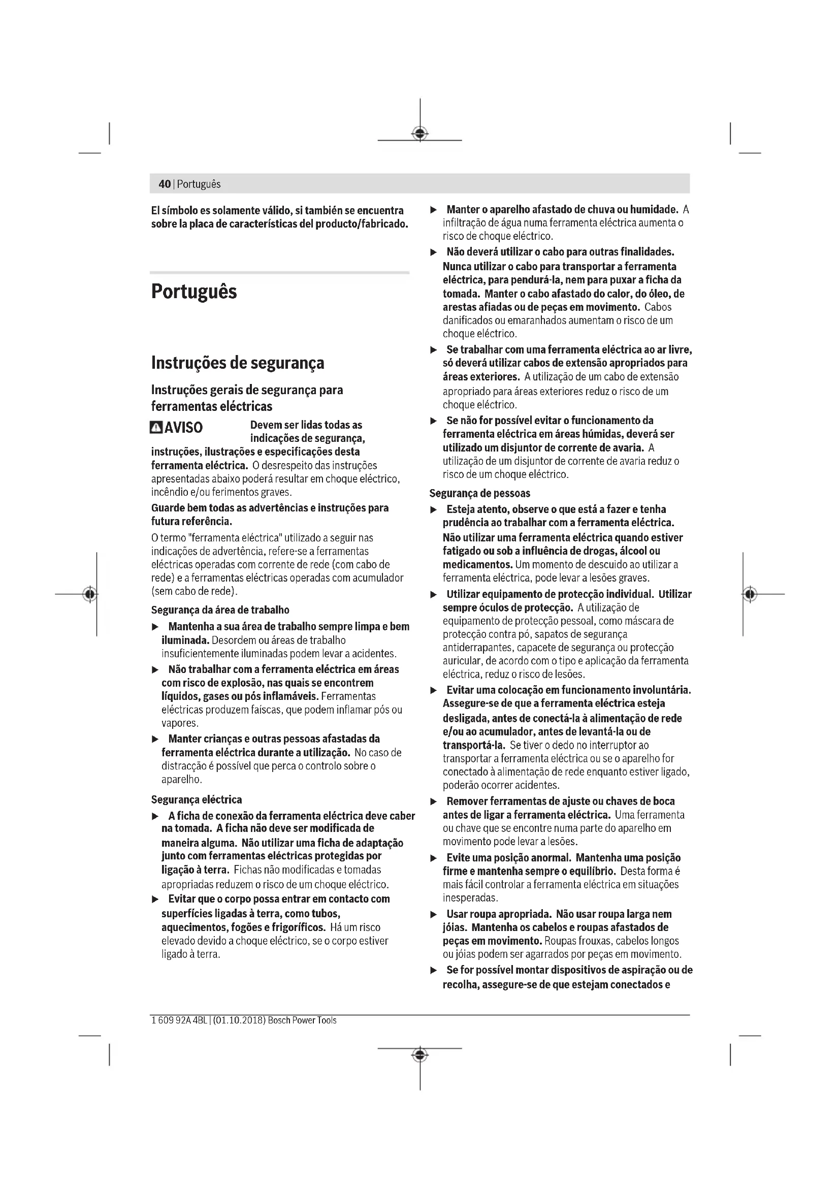 Português | 45 Bosch Power Tools 1 609 92A 4BL | (01.10.2018)46 | Português 1 609 92A 4BL | (01.10.2018) Bosch Power Tools Folha de lixar Material Aplicação Grão qualidade branca – Tinta – Verniz – Betume de enchimento – Espátula Para lixar tinta grosseira 40