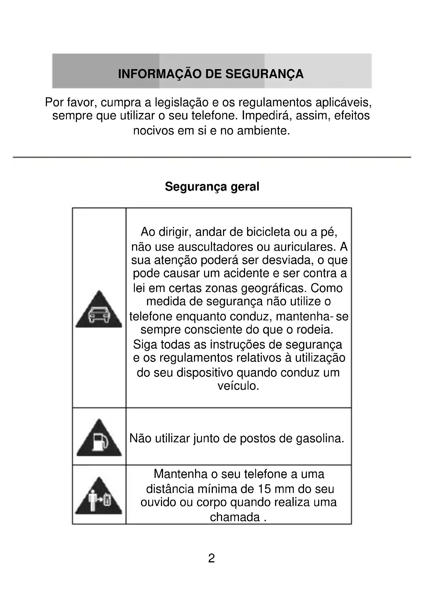 Mantenha o seu telefone a uma distância mínima de 15 mm do seu ouvido ou corpo quando realiza uma chamada . 2PT