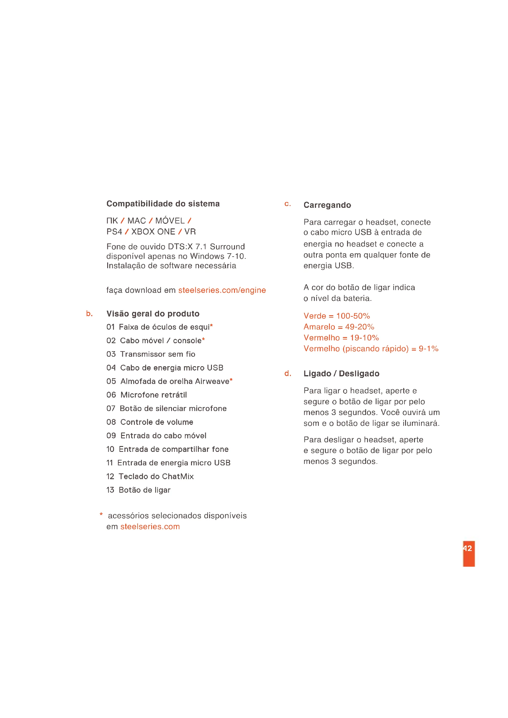 Plataformas: Windows 7 - Windows 10 Mac OS X 10.8 - 10.11* 120 MB de espaço livre em disco para a instalação42 faça download em steelseries.com/engine Compatibilidade do sistema