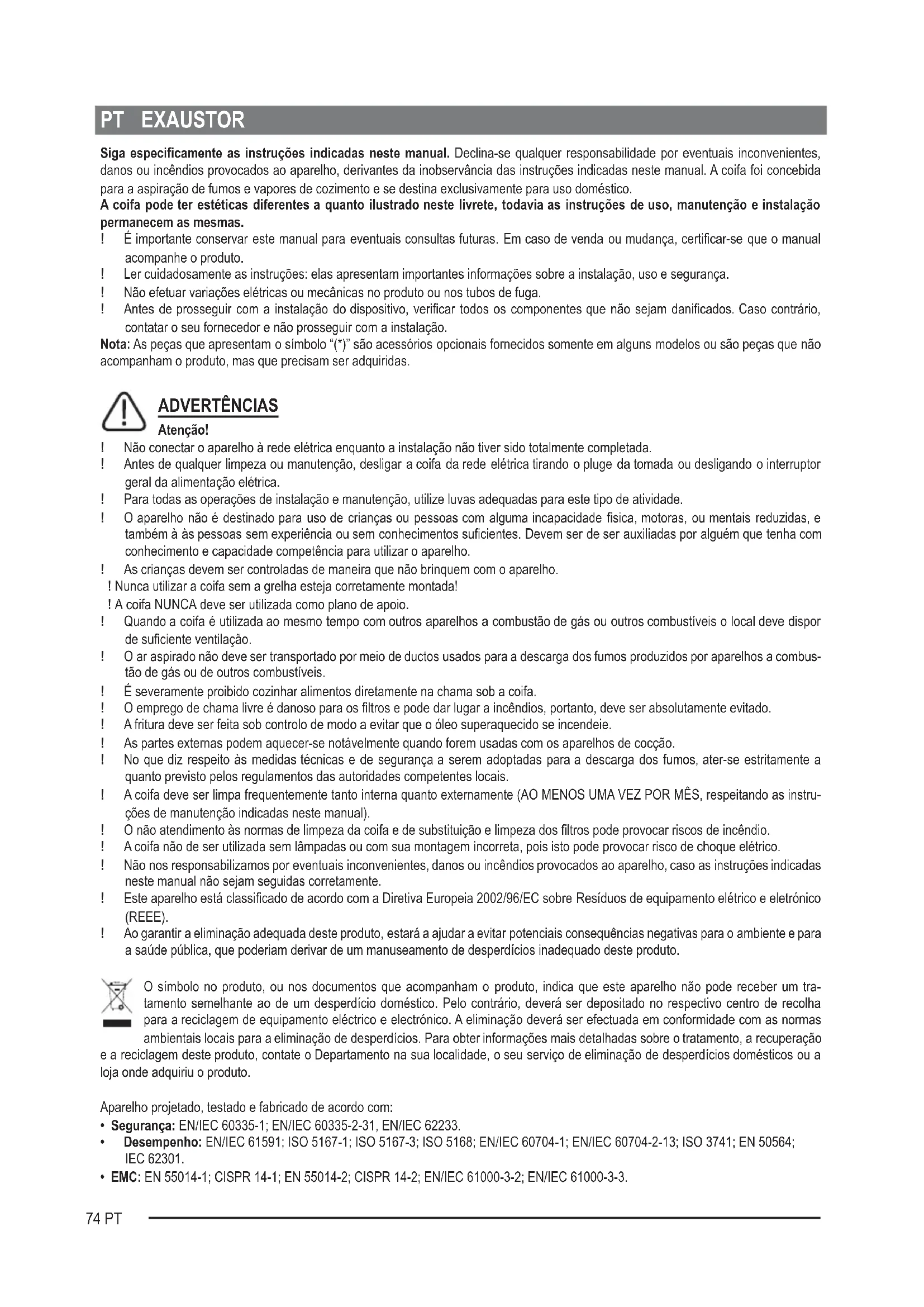 - EMC: EN 55014-1; CISPR 14-1; EN 55014-2; CISPR 14-2; EN/IEC 61000-3-2; EN/IEC 61000-3-3.75PT Sugestões para uma utilização correta, de modo a reduzir o impacto ambiental: LIGUE a coifa na velocidade mínima quando começar a cozinhar e mantenha-a em função por mais alguns minutos após ter terminado. Aumente a velocidade somente em caso de muita fumaça ou vapor e use as velocidades altas somente em situações extremas. Substitua o(s) ltro(s) a carvão quando necessário, para manter uma boa eciência na redução dos odores. Limpe o(s) ltro(s) para gordura quando necessário para manter uma boa eciência do ltro para gordura. Use o diâmetro máximo do sistema de condutas indicado neste manual para otimizar a eciência e minimizar o ruído. ATENÇÃO! A não instalação dos parafusos e elementos de xação, conforme estas instruções, pode resultar em riscos elétricos. USO A coifa é fabricada para ser utilizada na versão aspirante, com exaustão externa do ar, ou ltrante, com recirculação interna. Versão aspirante Os vapores são evacuados para o exterior por meio de um tubo de descarga xado á ange de conexão que se encontra sobre o exaustor. O diâmetro do tubo de descarga deve ser equivalente ao diâmetro do anel de conexão. Na parte horizontal o tubo deve ter uma leve inclinação para cima (cerca de 10°) de modo a poder transportar o ar para fora mais facil- mente. Se o exaustor for dotada de ltros de carvão ativo, estes deverão ser tirados. Conectar a coifa ao tubos e orifícios de descarga de parede com diâmetro equivalente à saída de ar (ange de união). O uso de tubos ou orifícios de descarga de parede com diâmetro inferior pode provocar a diminuição da performance de aspiração e um drástico aumento do ruído. Não nos responsabilizamos a este respeito. ! Utilizar um tubo condutor com o comprimento não inferior ao indicado. ! Utilizar um tubo condutor com o menor número possível de curvas (ângulo máximo da curva: 90ºC 90°). ! Evitar alterações drásticas da seção do tubo (diâmetro). ! Usar um tubo condutor com o interior mais liso possível. ! O material do tubo condutor deve ser aprovado e estar em conformidade com a lei. Versãoltrante Deve ser utilizado um ltro de carvão ativo, disponível junto ao seu revendedor. O ar aspirado será desengordurado e desodorizado antes de ser reintroduzido no ambiente através da grelha superior. INSTALAÇÃO A distância mínima entre a superfície de suporte dos recipientes sobre o fogão e a parte mais baixa da coifa não deve ser inferior a 55cm no caso de fogões elétricos e 65cm no caso de fogões a gás ou combinados. Se as instruções de instalação do fogão a gás especicarem uma distância maior, deve-se levar em conta esta indicação. Conexãoelétrica A voltagem da rede elétrica deve corresponder à voltagem indicada na etiqueta das características situada no interior da coifa. Se dotada de cha, conectar a coifa a uma tomada em conformidade com as normas vigentes posta em zona acessível,mesmo depois da instalação. Se não dotada de cha (conexão direta à rede) ou a tomada não se encontra em zona acessível,mesmo depois da instalação, aplicar um interruptor bipolar em conformidade com a norma que assegure a desconexão completa da rede nas condições da categoria de sobreten- são III, conformemente às regras de instalação. Atenção! Antes de conectar novamente o circuito da coifa com a alimentação elétrica, vericar seu funcionamento, atentar sempre para que o cabo de rede esteja montado corretamente. O exaustor está equipado com um cabo de alimentação especial; no caso do cabo car danicado, efectuar um pedido ao serviço de assistência técnica. Montagem Produto com peso excessivo. A movimentação e a instalação do exaustor devem ser feitas por pelo menos duas ou mais pessoas. Antes de iniciar a instalação: