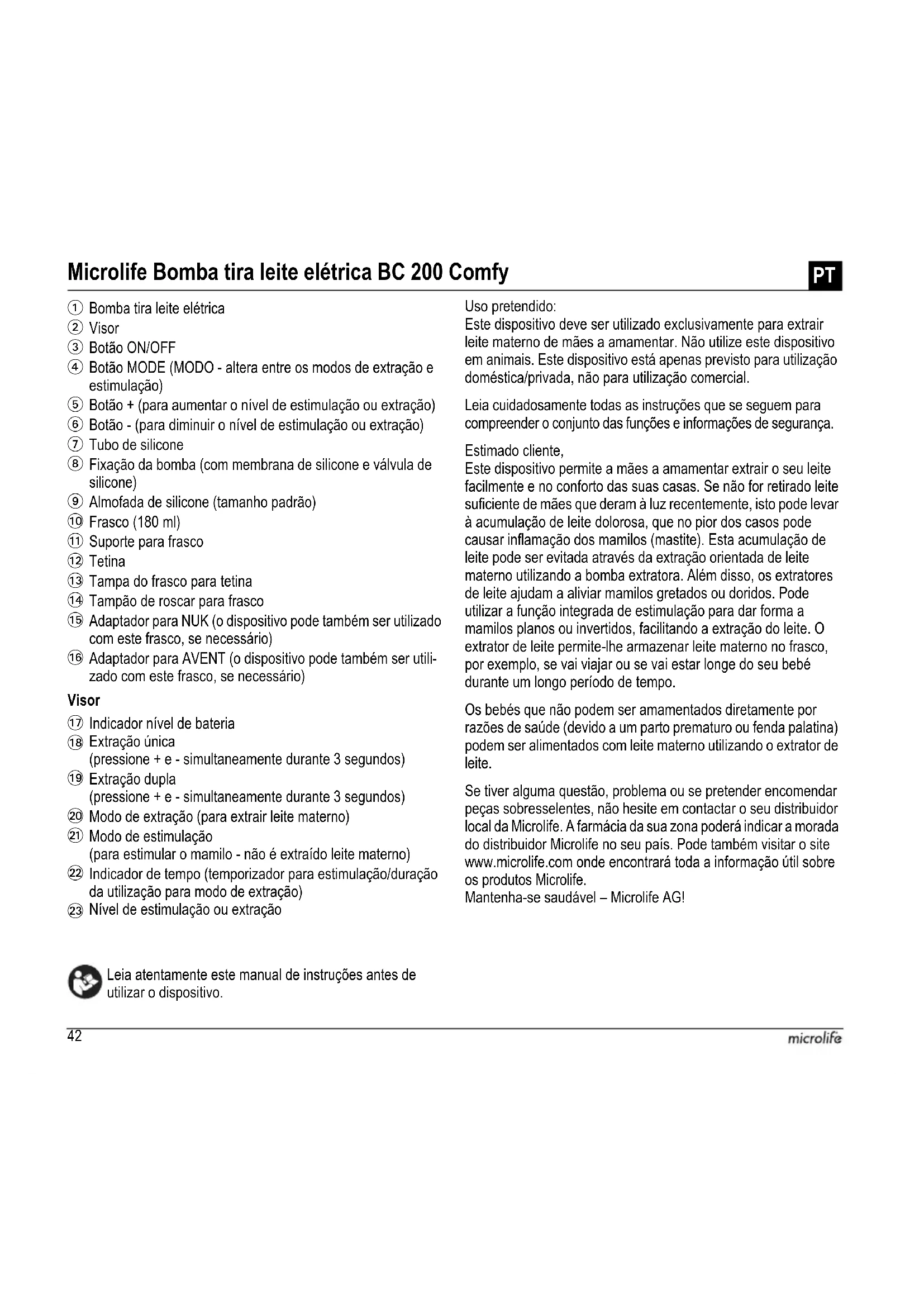 Elektr. Anschluss: 4 x 1,5 V Alkaline-Batterien, Grösse AA Netzadapter: Eingang: 100-240V AC 50/60Hz 0.5A Ausgang: 6V DC 1.0 A Batterie- Lebensdauer: 500 Stunden IP Klasse: IP21 Durchschnitt- liche Lebens- dauer: 500 Stunden Betriebsdauer: 30 min. Ein / 30 min. Aus Anwendungsteil Typ BF (Gerät zur Benutzung in Abwe- senheit von explosiven oder giftigen Gasgemischen oder Stickstoffoxiden (Lachgas).42 Visor Leia atentamente este manual de instruções antes de utilizar o dispositivo. Uso pretendido: Este dispositivo deve ser utilizado exclusivamente para extrair leite materno de mães a amamentar. Não utilize este dispositivo em animais. Este dispositivo está apenas previsto para utilização doméstica/privada, não para utilização comercial. Leia cuidadosamente todas as instruções que se seguem para compreender o conjunto das funções e informações de segurança. Estimado cliente, Este dispositivo permite a mães a amamentar extrair o seu leite facilmente e no conforto das suas casas. Se não for retirado leite suficiente de mães que deram à luz recentemente, isto pode levar à acumulação de leite dolorosa, que no pior dos casos pode causar inflamação dos mamilos (mastite). Esta acumulação de leite pode ser evitada através da extração orientada de leite materno utilizando a bomba extratora. Além disso, os extratores de leite ajudam a aliviar mamilos gretados ou doridos. Pode utilizar a função integrada de estimulação para dar forma a mamilos planos ou invertidos, facilitando a extração do leite. O extrator de leite permite-lhe armazenar leite materno no frasco, por exemplo, se vai viajar ou se vai estar longe do seu bebé durante um longo período de tempo. Os bebés que não podem ser amamentados diretamente por razões de saúde (devido a um parto prematuro ou fenda palatina) podem ser alimentados com leite materno utilizando o extrator de leite. Se tiver alguma questão, problema ou se pretender encomendar peças sobresselentes, não hesite em contactar o seu distribuidor local da Microlife. A farmácia da sua zona poderá indicar a morada do distribuidor Microlife no seu país. Pode também visitar o site www.microlife.com onde encontrará toda a informação útil sobre os produtos Microlife. Mantenha-se saudável – Microlife AG! Microlife Bomba tira leite elétrica BC 200 Comfy