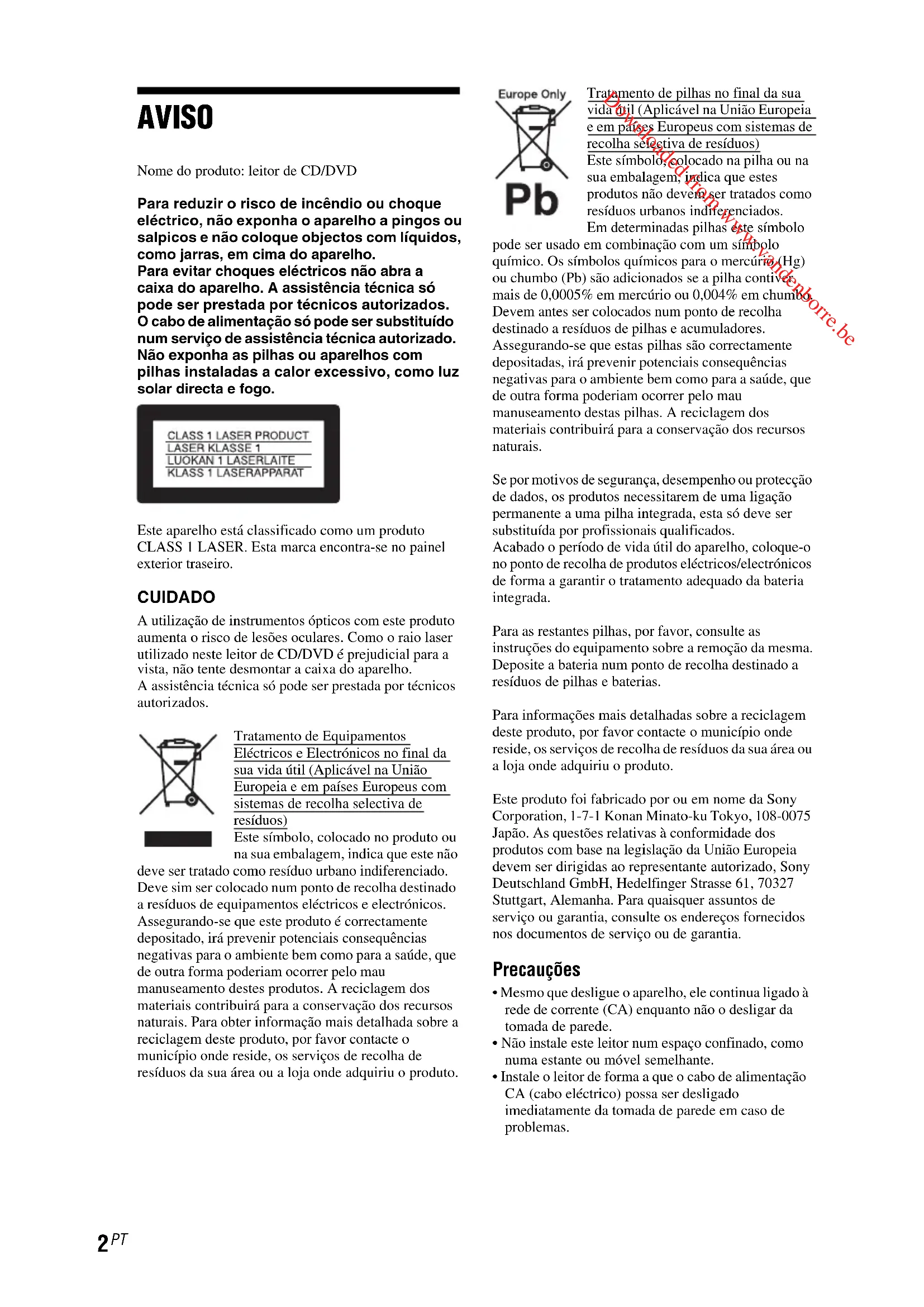 AVISO Nome do produto: leitor de CD/DVDPara reduzir o risco de incêndio ou choque eléctrico, não exponha o aparelho a pingos ou salpicos e não coloque objectos com líquidos, como jarras, em cima do aparelho.Para evitar choques eléctricos não abra a caixa do aparelho. A assistência técnica só pode ser prestada por técnicos autorizados.O cabo de alimentação só pode ser substituído num serviço de assistência técnica autorizado.Não exponha as pilhas ou aparelhos com pilhas instaladas a calor excessivo, como luz solar directa e fogo.Este aparelho está classificado como um produto CLASS 1 LASER. Esta marca encontra-se no painel exterior traseiro. CUIDADO A utilização de instrumentos ópticos com este produto aumenta o risco de lesões oculares. Como o raio laser utilizado neste leitor de CD/DVD é prejudicial para a vista, não tente desmontar a caixa do aparelho.A assistência técnica só pode ser prestada por técnicos autorizados.Tratamento de Equipamentos Eléctricos e Electrónicos no final da sua vida útil (Aplicável na União Europeia e em países Europeus com sistemas de recolha selectiva de resíduos)Este símbolo, colocado no produto ou na sua embalagem, indica que este não deve ser tratado como resíduo urbano indiferenciado. Deve sim ser colocado num ponto de recolha destinado a resíduos de equipamentos eléctricos e electrónicos. Assegurando-se que este produto é correctamente depositado, irá prevenir potenciais consequências negativas para o ambiente bem como para a saúde, que de outra forma poderiam ocorrer pelo mau manuseamento destes produtos. A reciclagem dos materiais contribuirá para a conservação dos recursos naturais. Para obter informação mais detalhada sobre a reciclagem deste produto, por favor contacte o município onde reside, os serviços de recolha de resíduos da sua área ou a loja onde adquiriu o produto.Tratamento de pilhas no final da sua vida útil (Aplicável na União Europeia e em países Europeus com sistemas de recolha selectiva de resíduos)Este símbolo, colocado na pilha ou na sua embalagem, indica que estes produtos não devem ser tratados como resíduos urbanos indiferenciados.Em determinadas pilhas este símbolo pode ser usado em combinação com um símbolo químico. Os símbolos químicos para o mercúrio (Hg) ou chumbo (Pb) são adicionados se a pilha contiver mais de 0,0005% em mercúrio ou 0,004% em chumbo.Devem antes ser colocados num ponto de recolha destinado a resíduos de pilhas e acumuladores.Assegurando-se que estas pilhas são correctamente depositadas, irá prevenir potenciais consequências negativas para o ambiente bem como para a saúde, que de outra forma poderiam ocorrer pelo mau manuseamento destas pilhas. A reciclagem dos materiais contribuirá para a conservação dos recursos naturais.Se por motivos de segurança, desempenho ou protecção de dados, os produtos necessitarem de uma ligação permanente a uma pilha integrada, esta só deve ser substituída por profissionais qualificados.Acabado o período de vida útil do aparelho, coloque-o no ponto de recolha de produtos eléctricos/electrónicos de forma a garantir o tratamento adequado da bateria integrada.Para as restantes pilhas, por favor, consulte as instruções do equipamento sobre a remoção da mesma. Deposite a bateria num ponto de recolha destinado a resíduos de pilhas e baterias.Para informações mais detalhadas sobre a reciclagem deste produto, por favor contacte o município onde reside, os serviços de recolha de resíduos da sua área ou a loja onde adquiriu o produto.Este produto foi fabricado por ou em nome da Sony Corporation, 1-7-1 Konan Minato-ku Tokyo, 108-0075 Japão. As questões relativas à conformidade dos produtos com base na legislação da União Europeia devem ser dirigidas ao representante autorizado, Sony Deutschland GmbH, Hedelfinger Strasse 61, 70327 Stuttgart, Alemanha. Para quaisquer assuntos de serviço ou garantia, consulte os endereços fornecidos nos documentos de serviço ou de garantia. Precauções