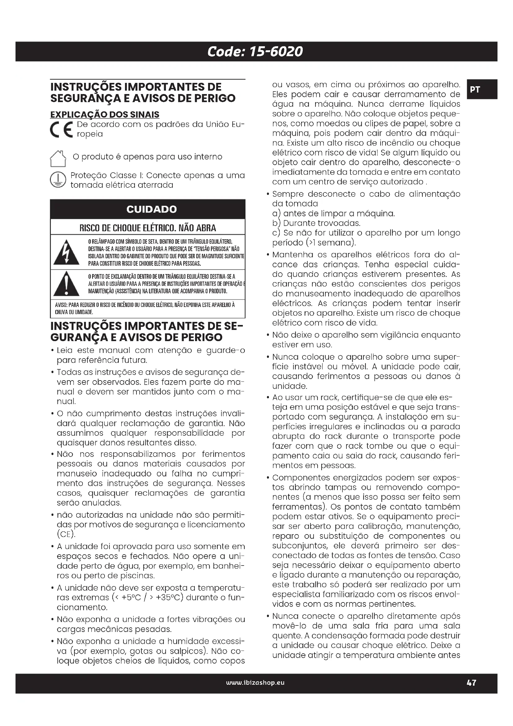 www.ibizashop.eu Bateria de controle remoto ....................................CR2025 Fonte de alimentação .............220-240V~ / 50-60Hz Fonte de alimentação CC ....................................15V 𝌃 4A Dimensões do produto .....................300x350x560mm Peso líquido .....................................................................................13kg Dimensões da embalagem ........ 400x378x635mm Peso Bruto .....................................................................................14,5kg