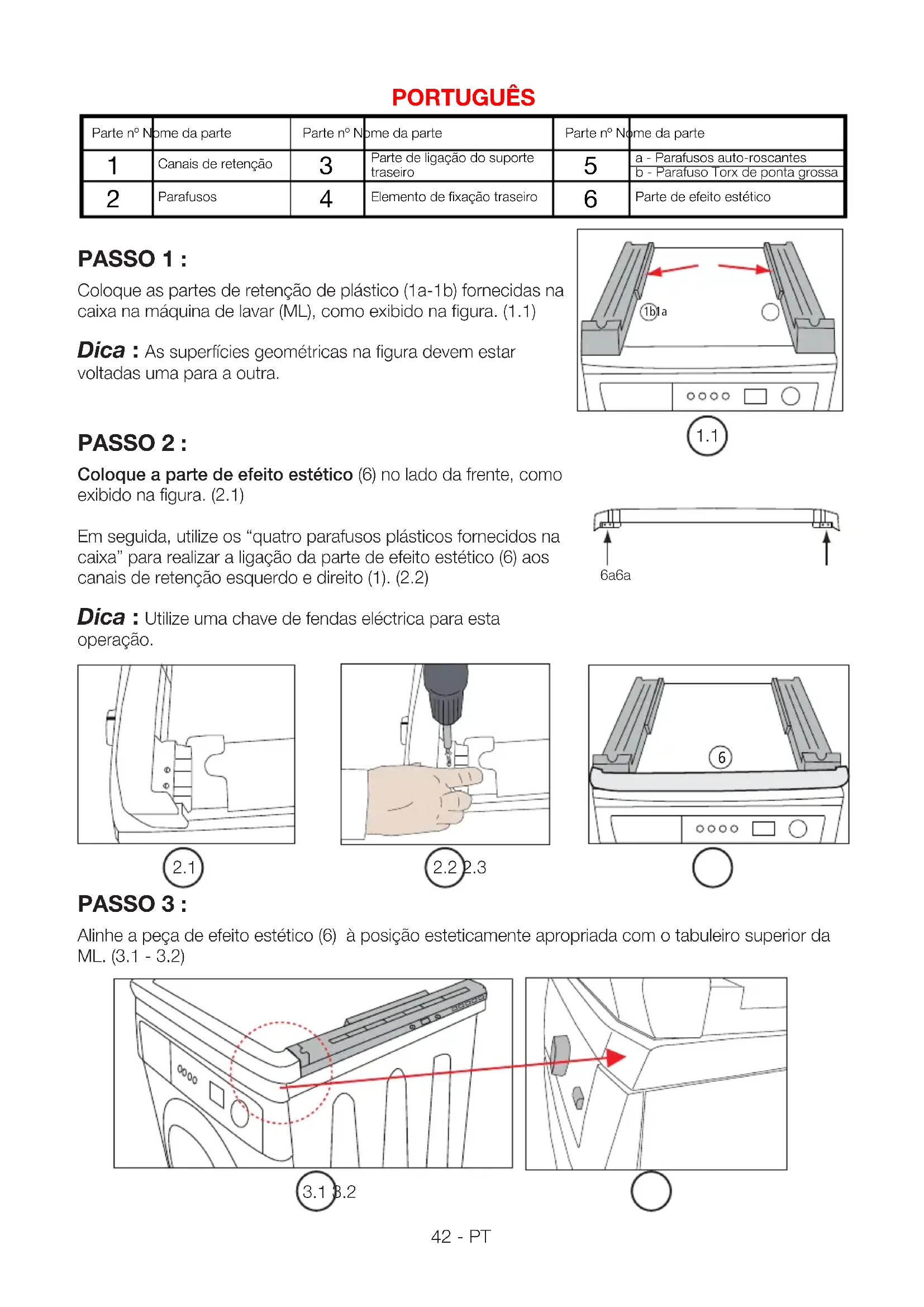 Utilice destornilladores eléctricos solo durante la colocación de los tornillos. 4a42 - PT PASSO 1 : Coloque as partes de retenção de plástico (1a-1b) fornecidas na caixa na máquina de lavar (ML), como exibido na figura. (1.1) Dica : As superfícies geométricas na figura devem estar voltadas uma para a outra. PASSO 2 : Coloque a parte de efeito estético (6) no lado da frente, como exibido na figura. (2.1) Em seguida, utilize os “quatro parafusos plásticos fornecidos na caixa” para realizar a ligação da parte de efeito estético (6) aos canais de retenção esquerdo e direito (1). (2.2) Dica : Utilize uma chave de fendas eléctrica para esta operação. PASSO 3 : Alinhe a peça de efeito estético (6) à posição esteticamente apropriada com o tabuleiro superior da ML. (3.1 - 3.2) Parte nº Nome da parte Canais de retenção ParafusosParte nº Nome da parte Parte de ligação do suporte traseiro Elemento de fixação traseiroParte nº Nome da parte