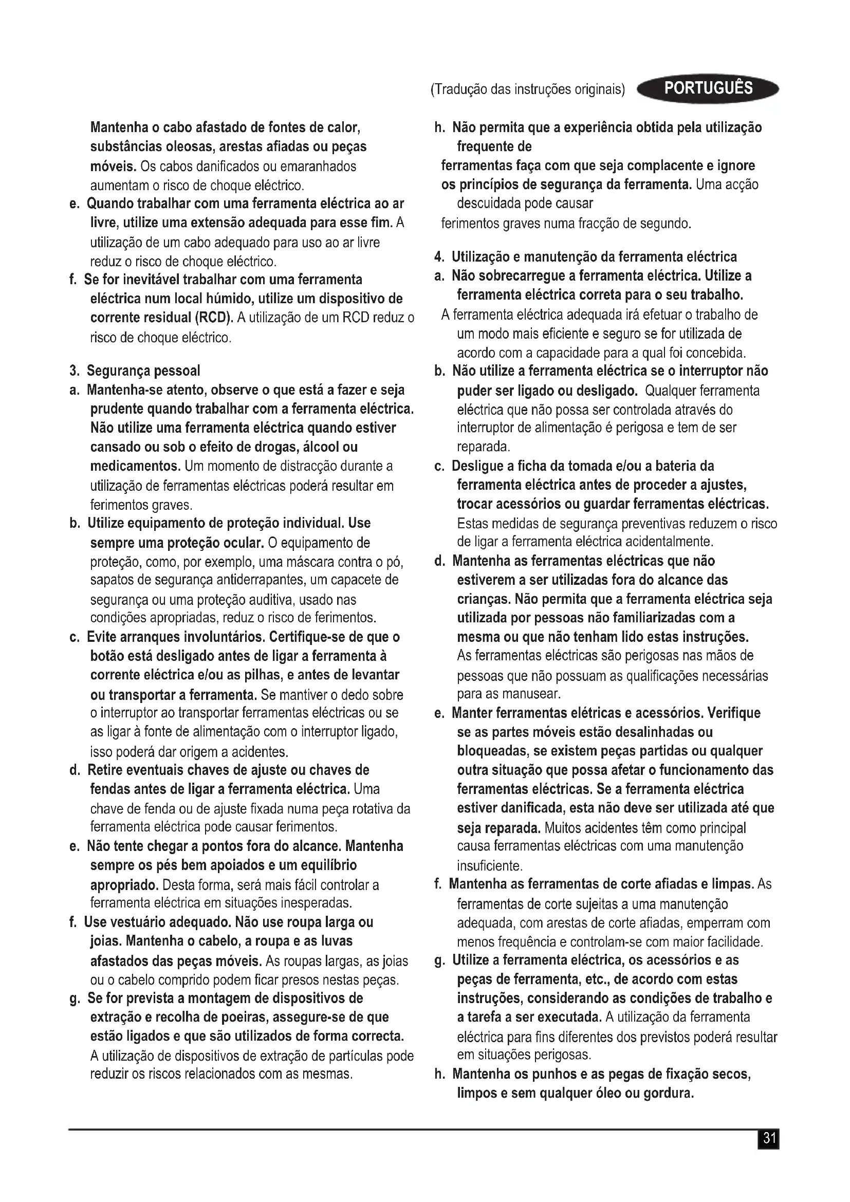 a. As chas da ferramenta eléctrica devem encaixar na tomada. Nunca modique a cha de forma alguma. Não utilize chas adaptadoras com ferramentas eléctricas ligadas à terra. As chas não modicadas e as tomadas compatíveis reduzem o risco de choque eléctrico. b. Evite que o corpo entre em contacto com superfícies ligadas à terra, como tubos, radiadores, fogões e frigorícos. Se o seu corpo estiver “ligado” à terra, o risco de choque eléctrico é maior. c. As ferramentas eléctricas não podem ser expostas a chuva nem humidade. A entrada de água numa ferramenta eléctrica aumenta o risco de choque eléctrico. d. Manuseie o cabo com cuidado. Nunca o utilize para transportar, puxar ou desligar a ferramenta eléctrica.31 (Tradução das instruções originais) PORTUGUÊS Mantenha o cabo afastado de fontes de calor, substâncias oleosas, arestas aadas ou peças móveis. Os cabos danicados ou emaranhados aumentam o risco de choque eléctrico. e. Quando trabalhar com uma ferramenta eléctrica ao ar livre, utilize uma extensão adequada para esse m. A utilização de um cabo adequado para uso ao ar livre reduz o risco de choque eléctrico. f. Se for inevitável trabalhar com uma ferramenta eléctrica num local húmido, utilize um dispositivo de corrente residual (RCD). A utilização de um RCD reduz o risco de choque eléctrico.