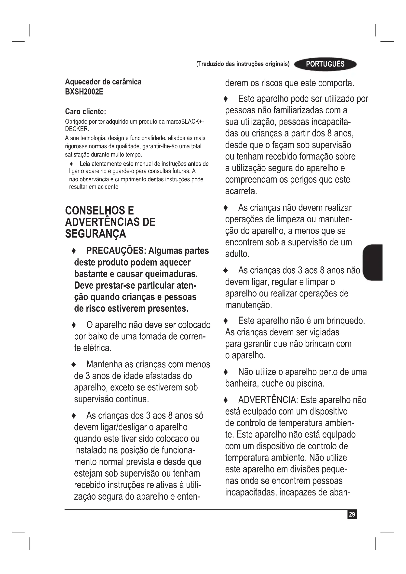 Aquecedor de cerâmica BXSH2002E Caro cliente: Obrigado por ter adquirido um produto da marcaBLACK+- DECKER. A sua tecnologia, design e funcionalidade, aliados às mais rigorosas normas de qualidade, garantir-lhe-ão uma total satisfação durante muito tempo. ♦ Leia atentamente este manual de instruções antes de ligar o aparelho e guarde-o para consultas futuras. A não observância e cumprimento destas instruções pode resultar em acidente. CONSELHOS E