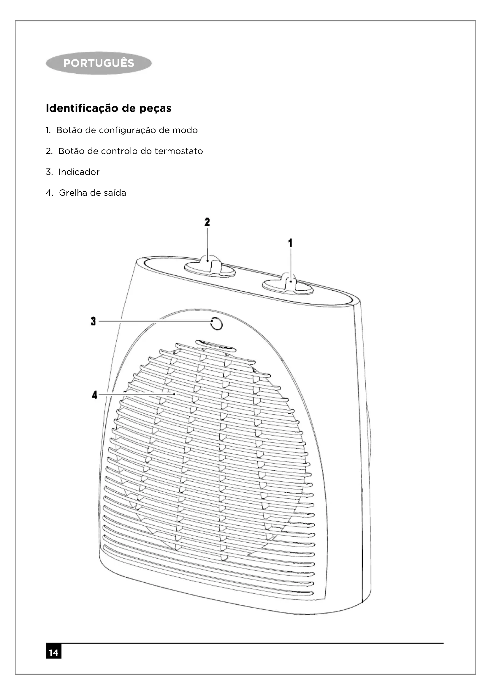 - A lâmpada indicadora indica que o modo aquecimento está ligado. Utilização O aparelho tem um termostato para sua segurança. A utilização contínua do aparelho por longos períodos de tempo pode provocar o sobreaquecimento e parar de funcionar. Recomenda-se que desligue o aparelho da tomada e que o deixe arrefecer antes de continuar a utilizar.